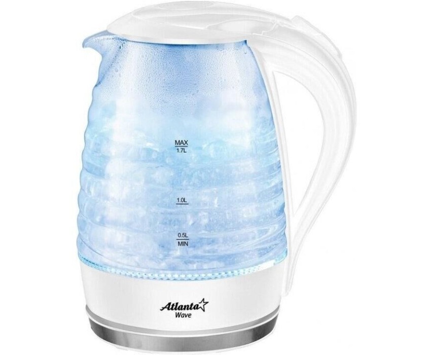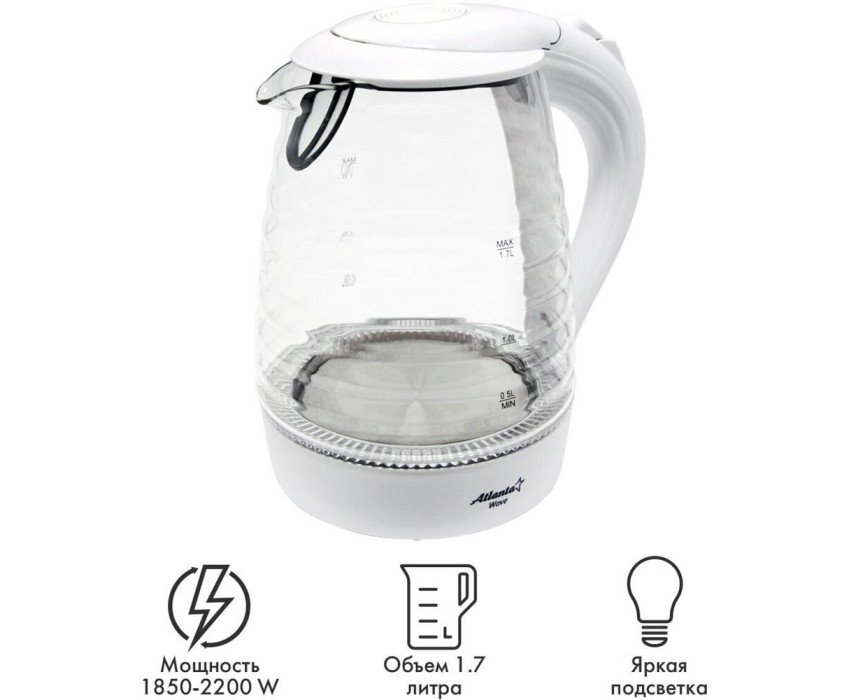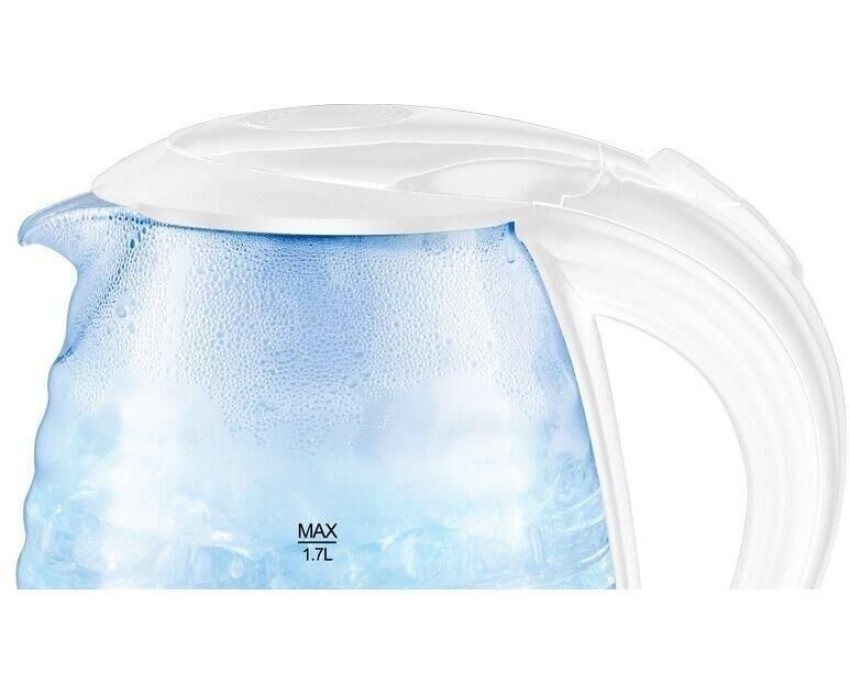 Объем 1,7 литра Корпус из термостойкого стекла Иллюминация Специальная ручка от скольжения Поворот на подставке на 360° Быстрое закипание Фильтр от накипи Закрытый нагревательный элемент Автоматическое отключение Защита от перегрева без воды Электрошнур в цокольной подставке, 64см Номинальная мощность 1850-2200 Вт 220-240 B ~ 50/60 Гц
