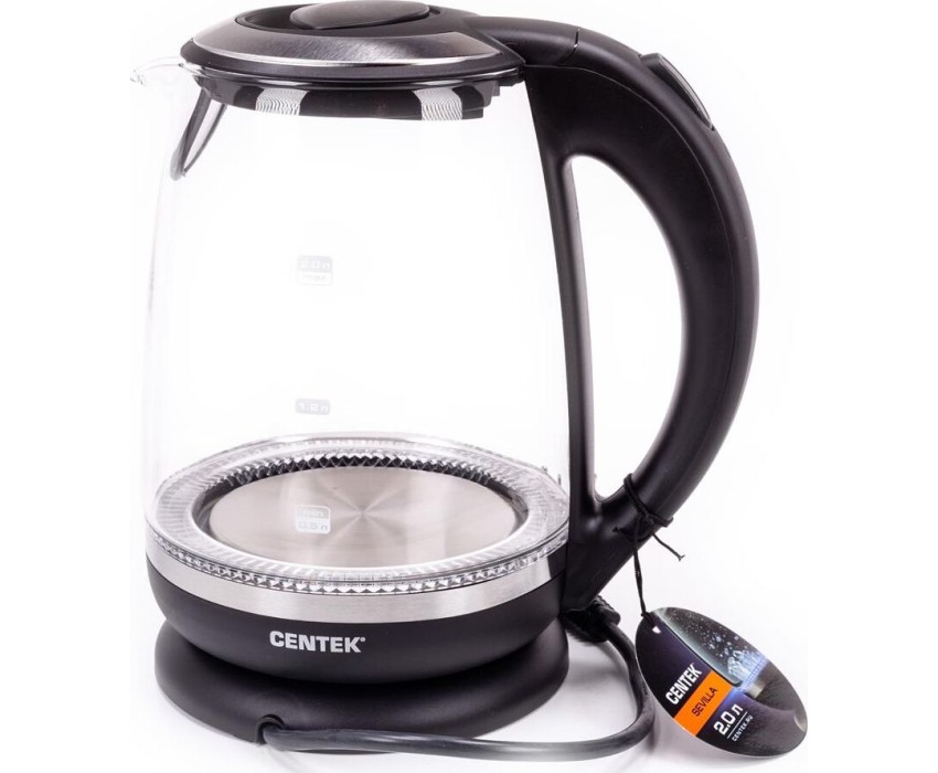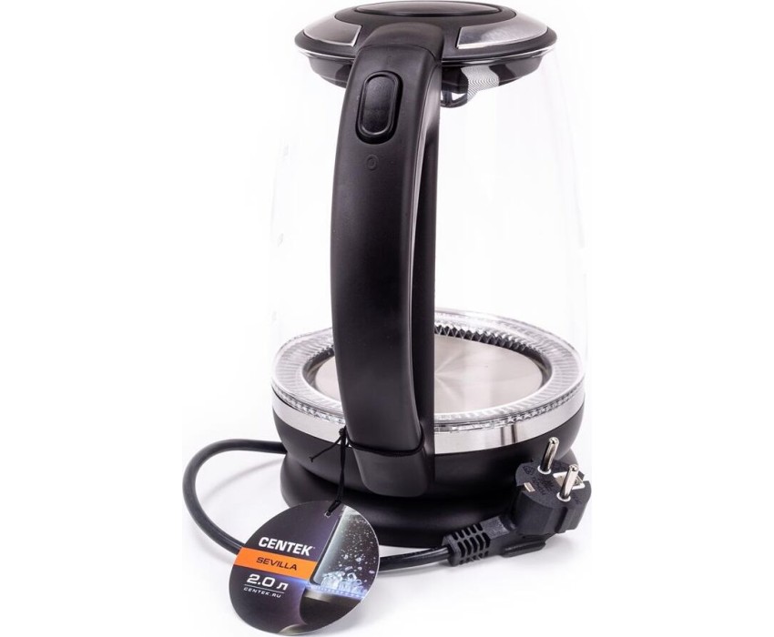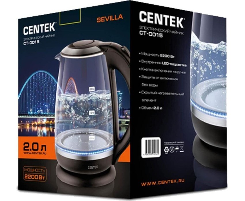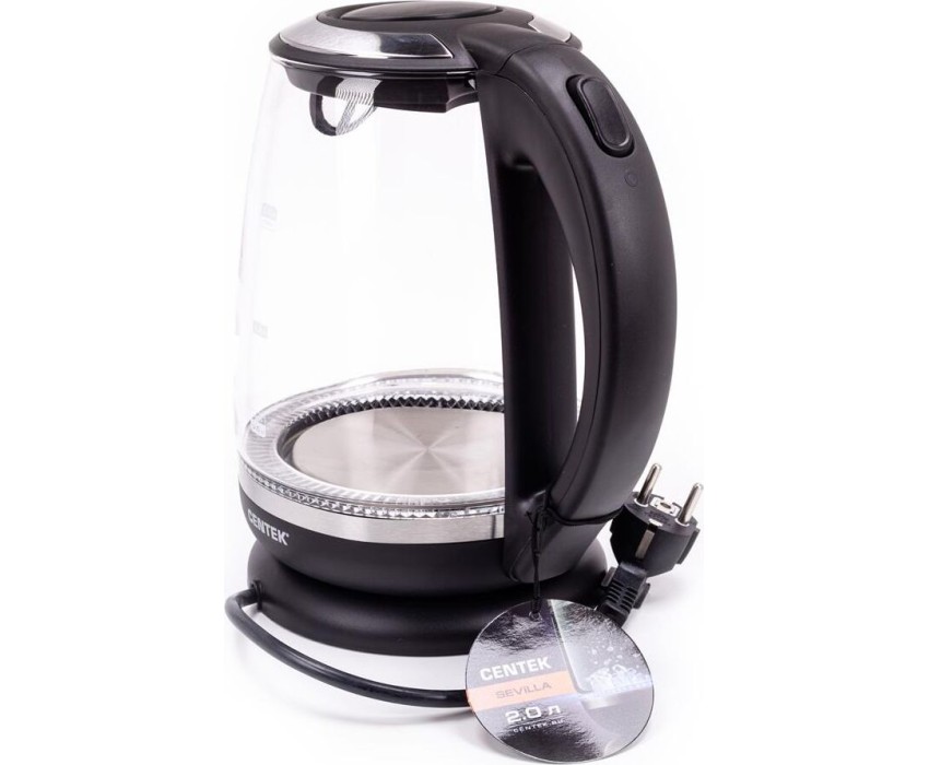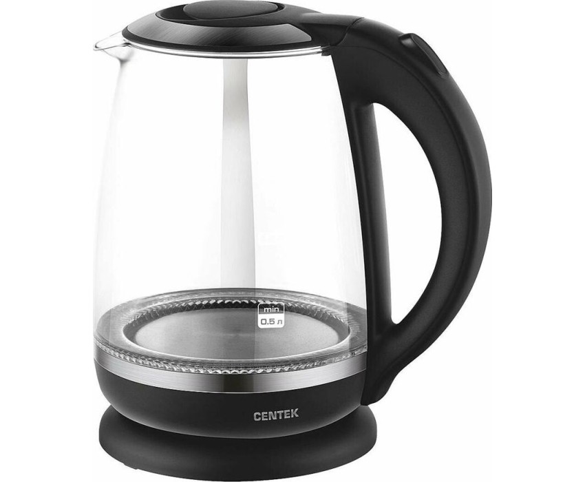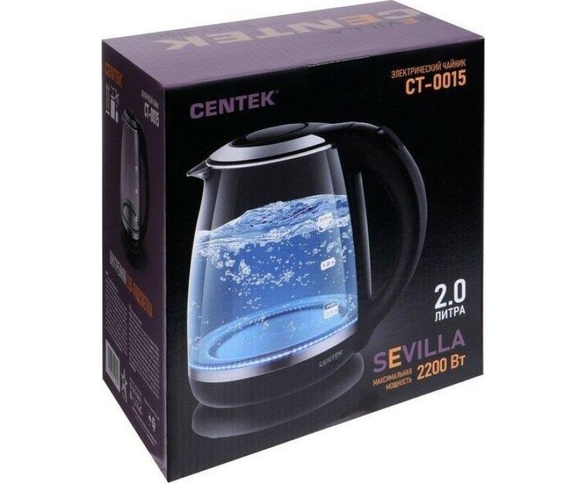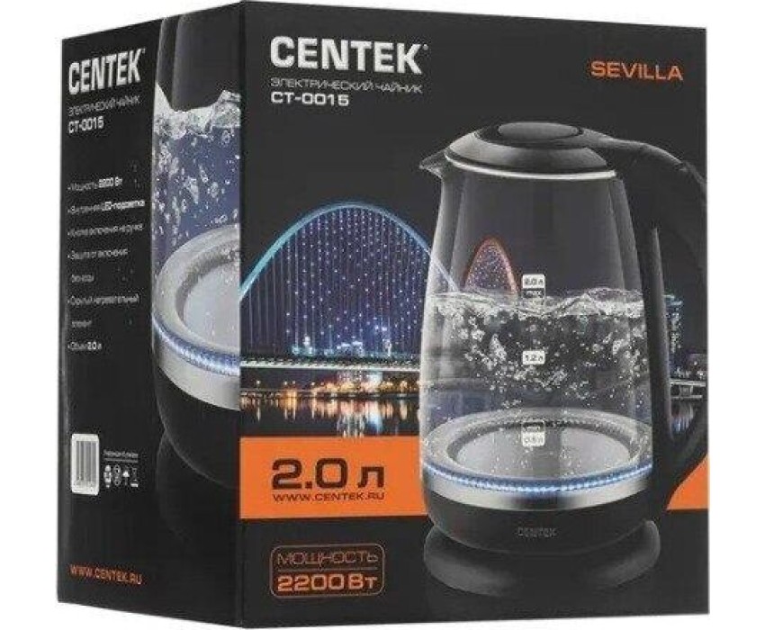 Чайник Centek CT-0015 Мощность2200 Вт Объем2,0 л Защита от включения без воды Внутренняя LED-подсветка Скрытый нагревательный элемент Кнопка включения на ручке Высокопрочная стеклянная колба