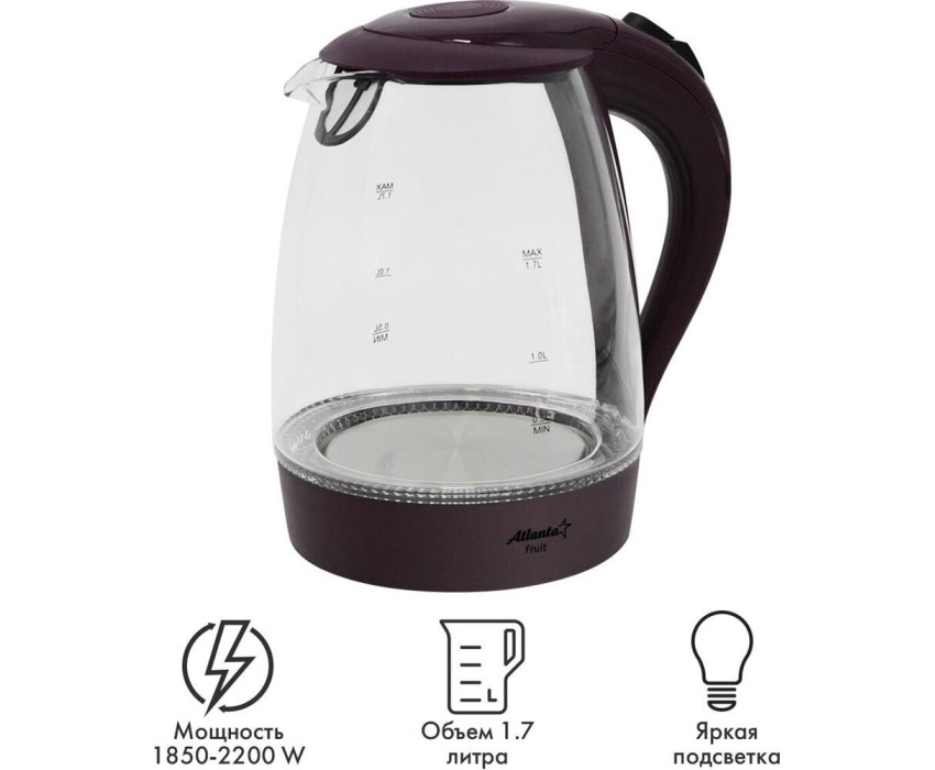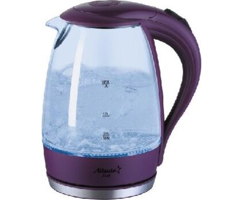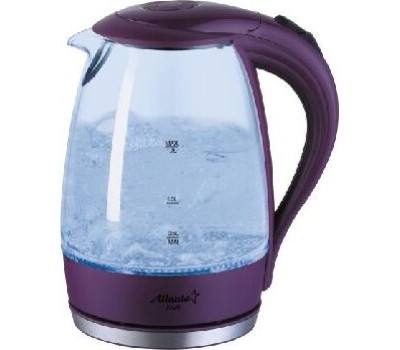 ATLANTA ATH-2461фиолетовый электрочайник Объем 1.5 л Потребляемая мощность 2000 Вт Нагревательный элемент скрытый Покрытие нагревательного элемента нержавеющая сталь Индикатор уровня воды Подсветка Материал стекло
