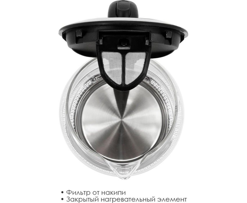 Объем 1,7 литра Корпус из термостойкого стекла Иллюминация Специальная ручка от скольжения Поворот на подставке на 360° Быстрое закипание Фильтр от накипи Закрытый нагревательный элемент Автоматическое отключение Защита от перегрева без воды Электрошнур в цокольной подставке Номинальная мощность 2000 Вт 230 B ~ 50 Гц