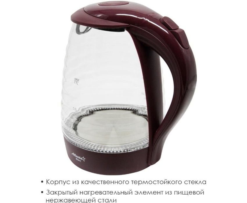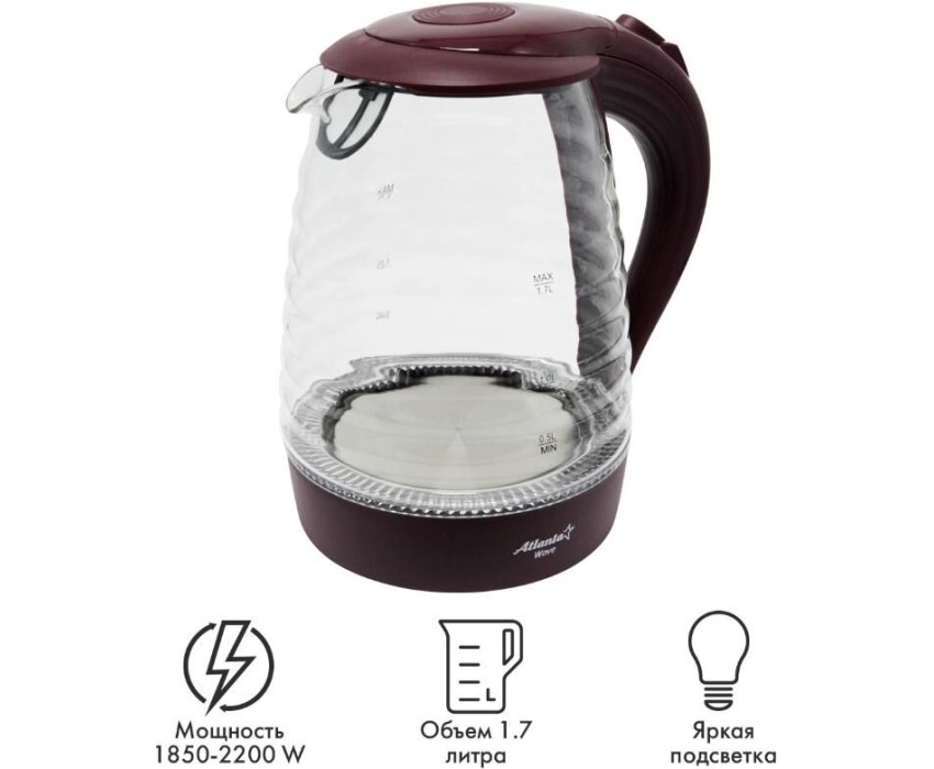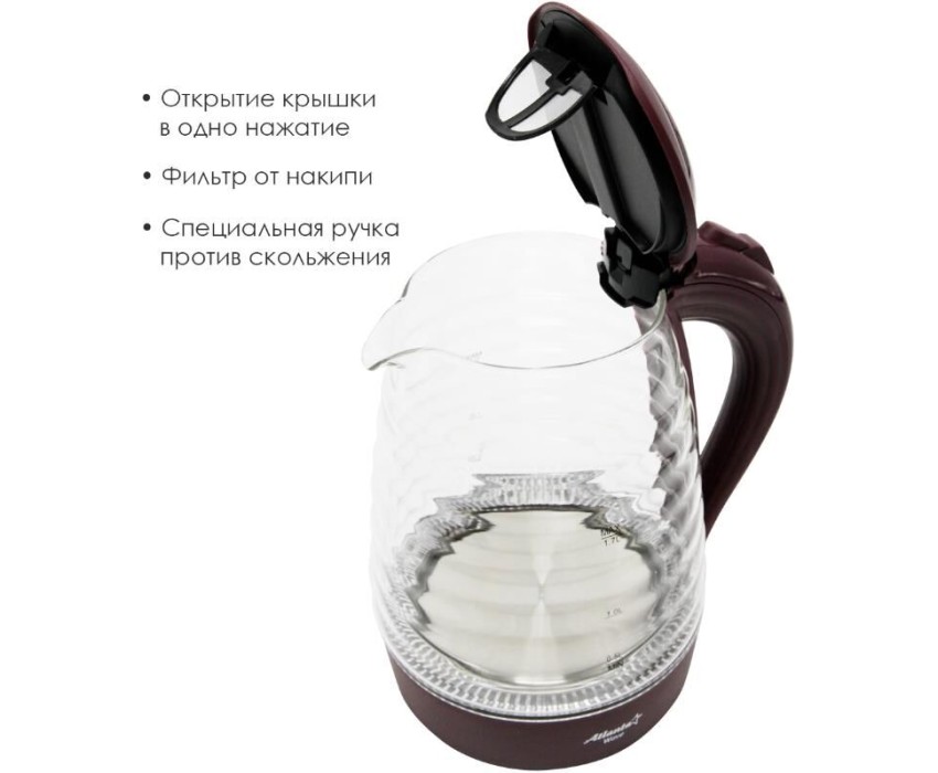Объем 1,7 литра Корпус из термостойкого стекла Иллюминация Специальная ручка от скольжения Поворот на подставке на 360° Быстрое закипание Фильтр от накипи Закрытый нагревательный элемент Автоматическое отключение Защита от перегрева без воды Электрошнур в цокольной подставке, 64см Номинальная мощность 1850-2200 Вт 220-240 B ~ 50/60 Гц