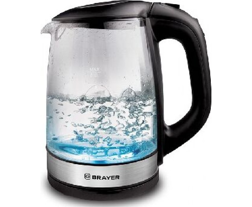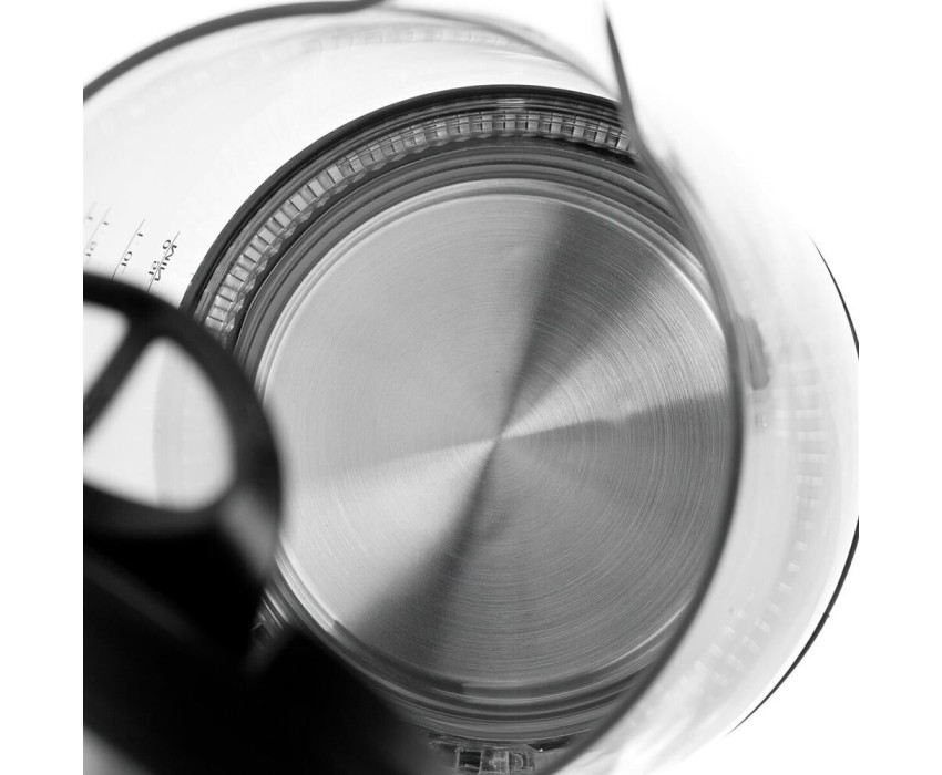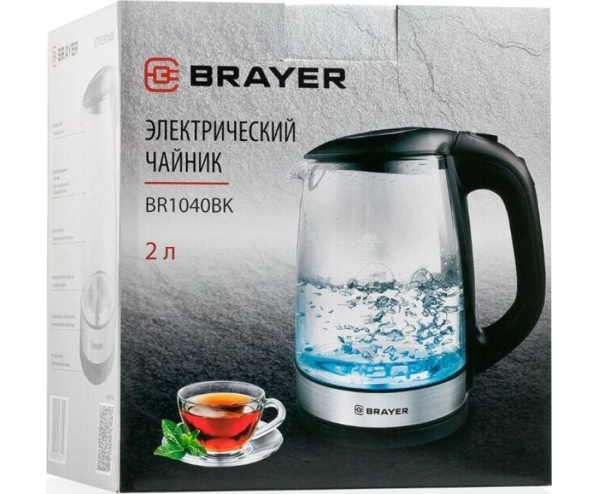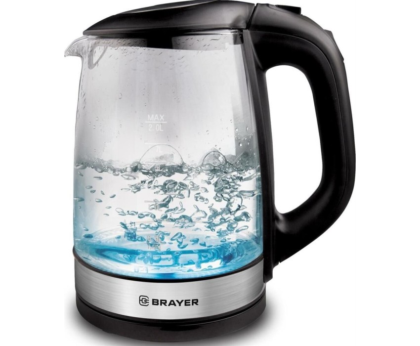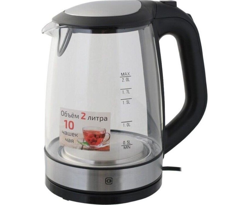 Максимальная мощность 2200 Вт Максимальный объём 2 л Корпус из высокопрочного термостойкого стекла Внутренняя подсветка Автоотключение при закипании воды Отключение при отсутствии воды Моющийся фильтр Противоскользящее основание Электропитание 220-240 В, ~50-60 Гц