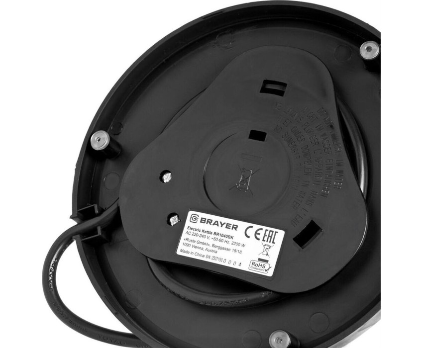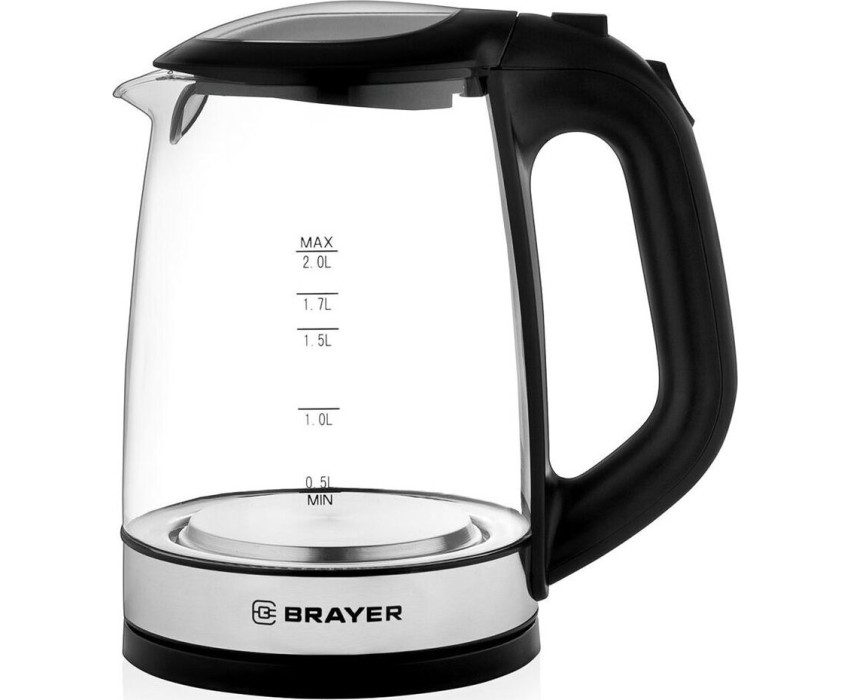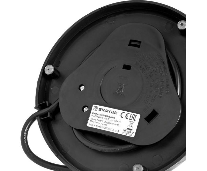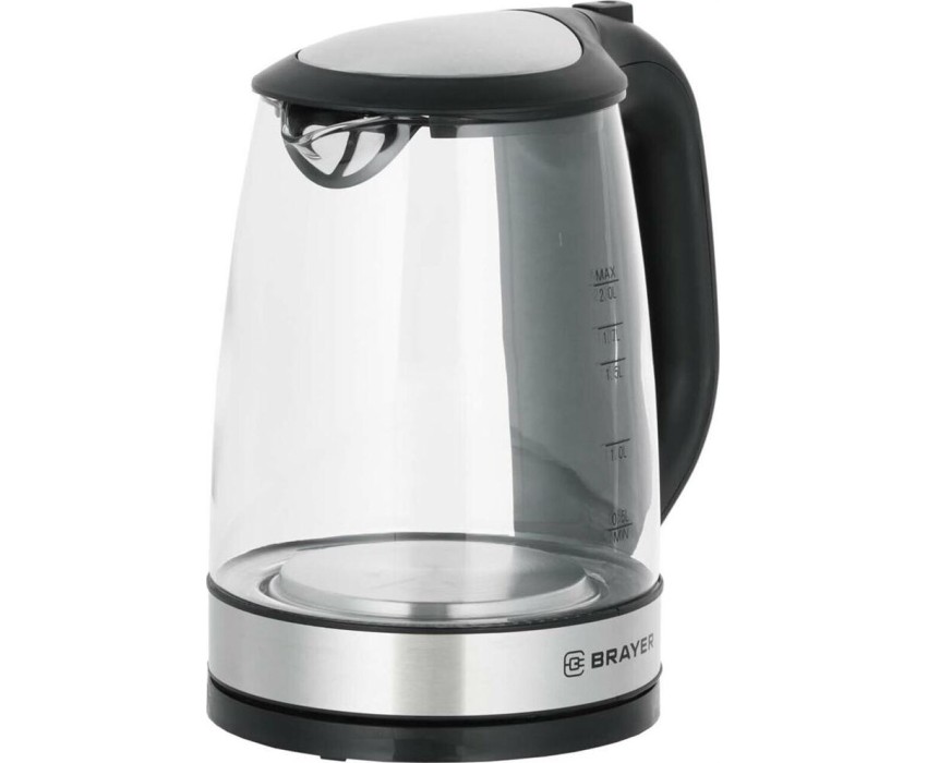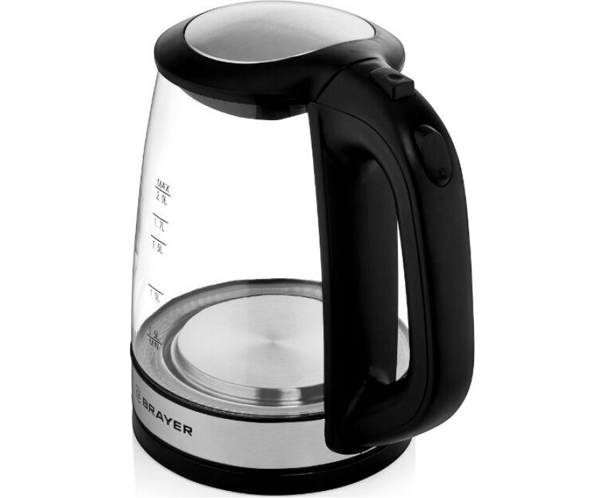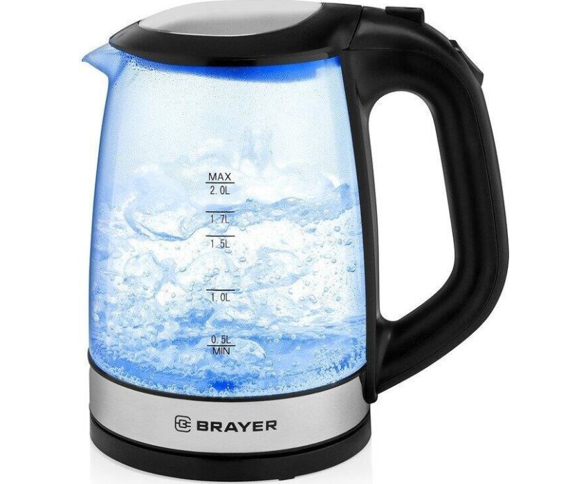 Максимальная мощность 2200 Вт Максимальный объём 2 л Корпус из высокопрочного термостойкого стекла Внутренняя подсветка Автоотключение при закипании воды Отключение при отсутствии воды Моющийся фильтр Противоскользящее основание Электропитание 220-240 В, ~50-60 Гц