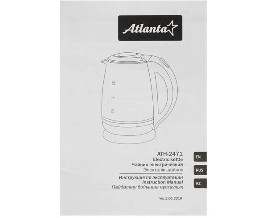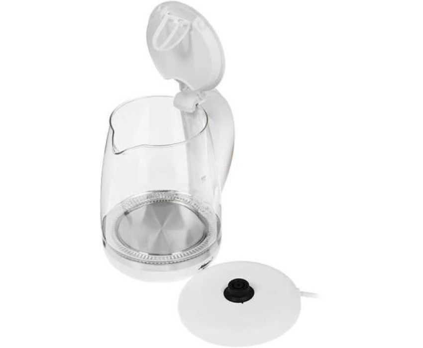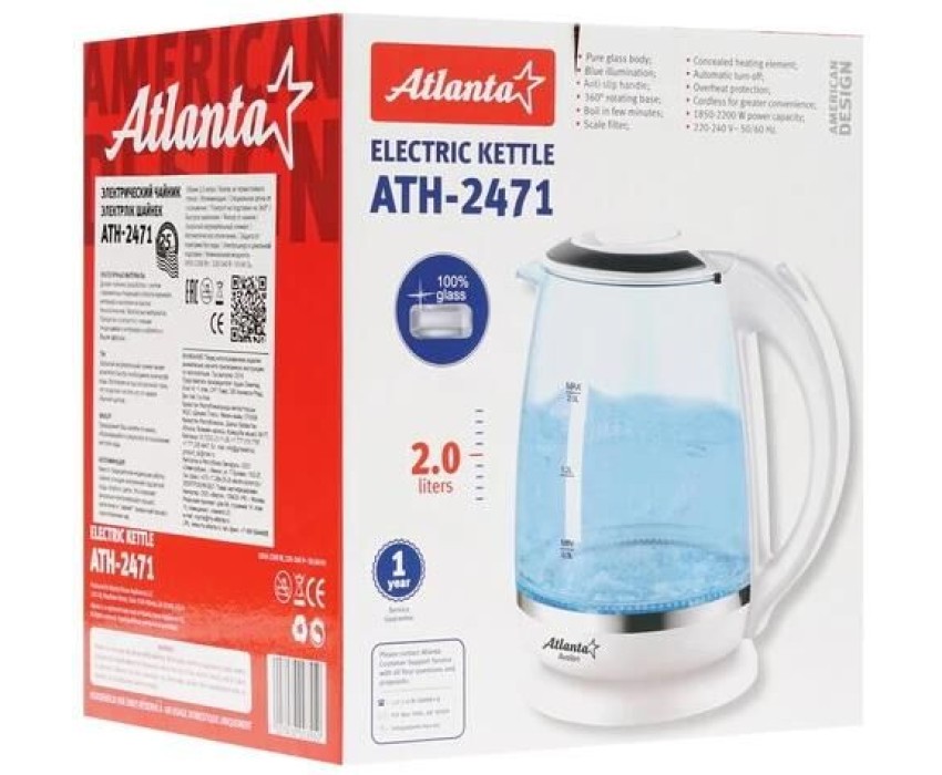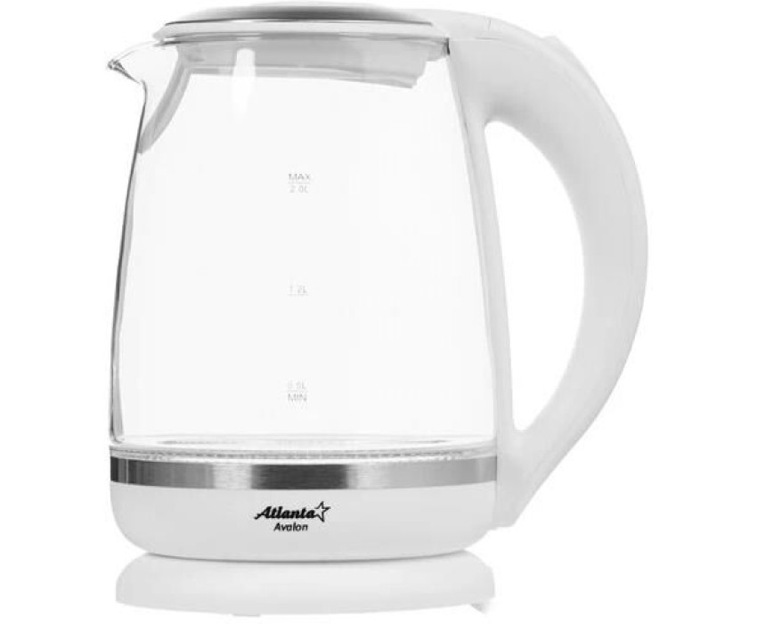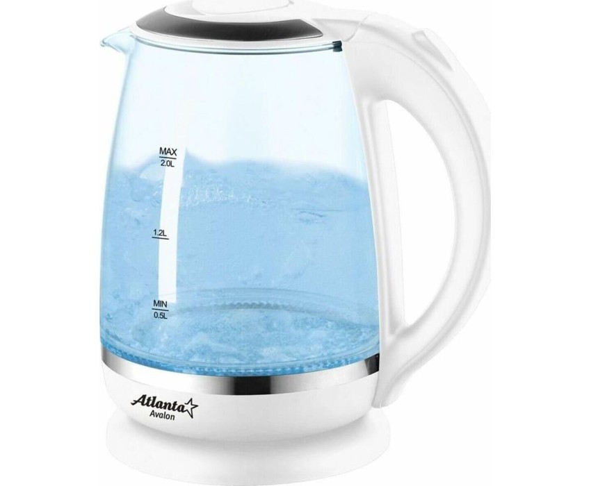 ATLANTA ATH-2471 (WHITE) Чайник стеклянный электрический Объем 2.0 литра Корпус из термостойкого стекла Иллюминация Специальная ручка от скольжения Поворот на подставке на 360° Быстрое закипание Фильтр от накипи Закрытый нагревательный элемент Автоматическое отключение Защита от перегрева без воды Электрошнур в цокольной подставке. 67см Номинальная мощность 1850-2200 Вт 220-240 B ~ 50/60 Гц