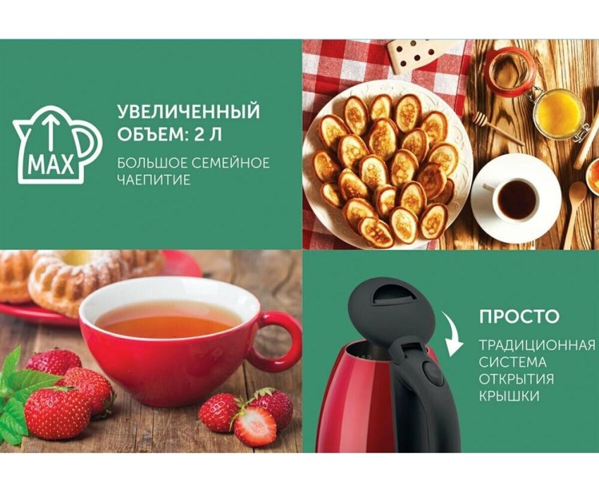 Мощность, Вт: 1800 Объем, л: 2 Способ открывания крышки: Традиционная система открытия крышки Индикатор работы: Да Индикатор уровня воды: Отметки MIN, MAX внутри Отсек для хранения электрошнура: Да Материал корпуса: Металл Вид нагревательного элемента: Закрытый Длина электрошнура, м: 0.6 Система многоуровневой безопасности Safe Work : Да Цвет: Красный