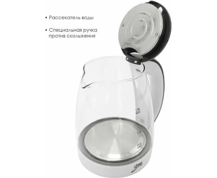 Корпус из термостойкого стекла. Объем 1,8 литра. Иллюминация. Специальная ручка от скольжения. Поворот на подставке на 360°. Быстрое закипание. Фильтр от накипи . Закрытый нагревательный элемент. Автоматическое отключение. Защита от перегрева без воды. Электрошнур в цокольной подставке, 48см. Номинальная мощность 1500 Вт. 230 B ~ 50 Гц.