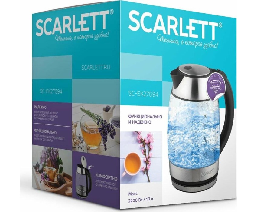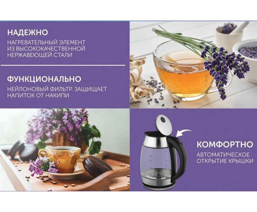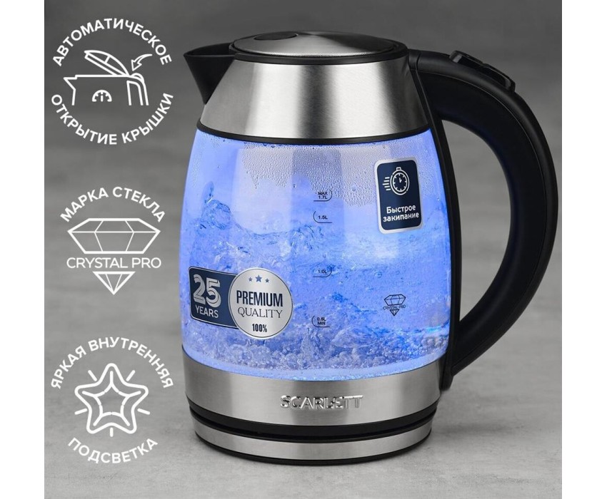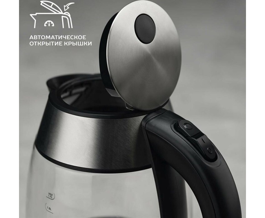 Мощность, Вт: 2200 Объем, л: 1.7 Способ открывания крышки: Автоматическая система открытия крышки Индикатор уровня воды: Шкала Отсек для хранения электрошнура: Да Материал корпуса: Стекло Вид нагревательного элемента: Закрытый Внутренняя подсветка: Да Фильтр: Да Вид/марка стекла: Crystal Pro Длина электрошнура, м: 0.75 Система многоуровневой безопасности «Safe Work»: Да Цвет: Сталь