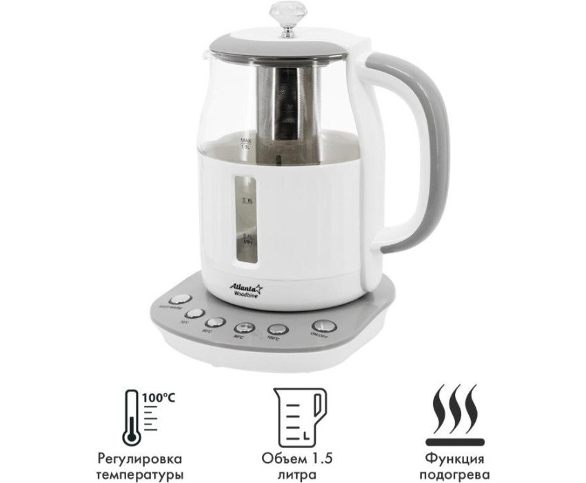 Объем 1,5 литра 5 режимов нагрева и поддержания температуры 70/80/90/100°С Корпус из термостойкого стекла Цифровой контроллер температуры Шкала уровня воды Поворот на подставке на 360° Быстрое закипание Фильтр от накипи Закрытый нагревательный элемент Автоматическое отключение Защита от перегрева без воды Электрошнур в цокольной подставке, 66см Мощность 1850-2200 Вт 220-240 B ~ 50/60 Гц