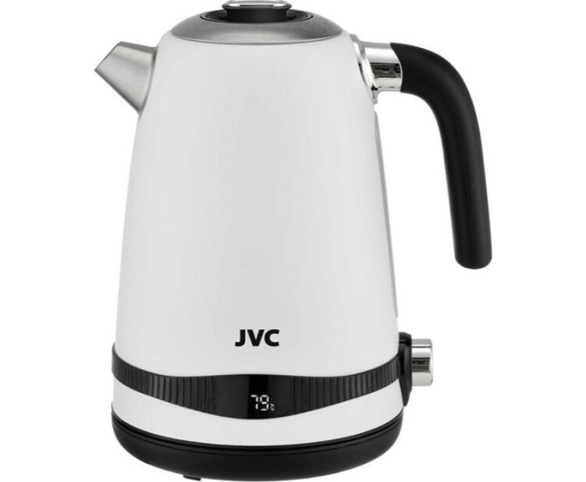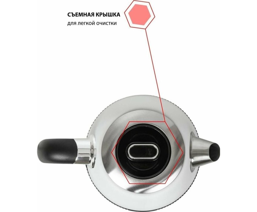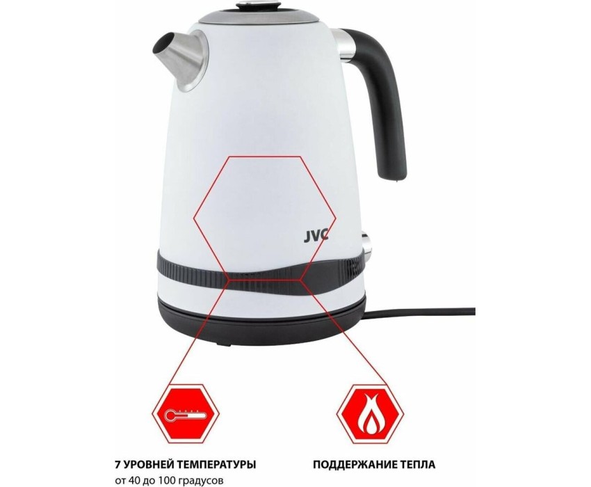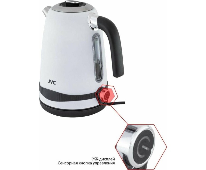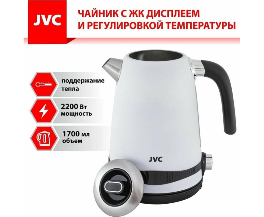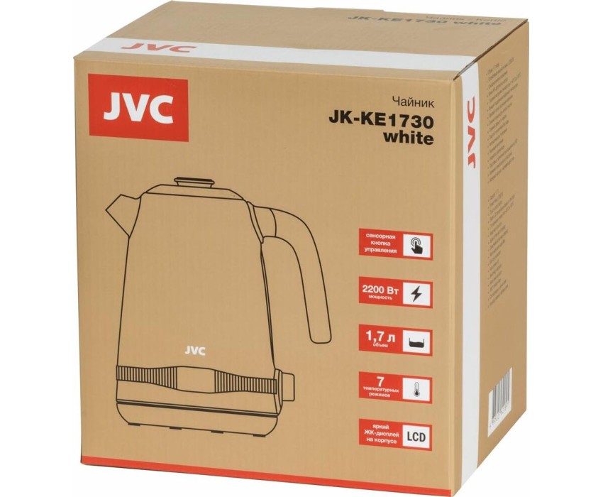 Чайник электрический, объем 1,7л, максимальная мощность 2200 Вт, сенсорная кнопка управления, ЖК дисплей на корпуче чайника, 7 уровней настройки температуры от 40 до 100 градусов, функция поддержания выбранной температуры, индикатор уровня воды, съемный фильтр от накипи, съемная крышка, защита от включения без воды, автоматическое отключение при закипании, вращение на 360 градусов, хранение электрошнура в подставке, корпус из нержавеющей стали покрытый спреем