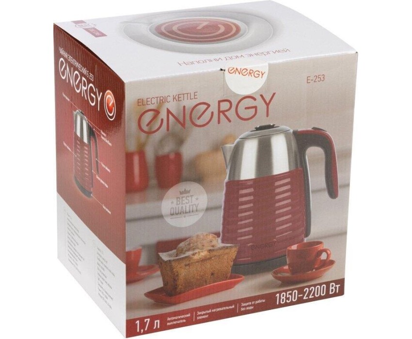 ENERGY E-253 (1,7 л, диск), стальной Объем 1,7л Мощность 220-240V,50/60Hz, 1850-2200W Корпус из нержавеющей стали Закрытый нагревающий элемент из нержавеющей стали Поворот на подставке 360° Защита от работы без воды Автоотключение