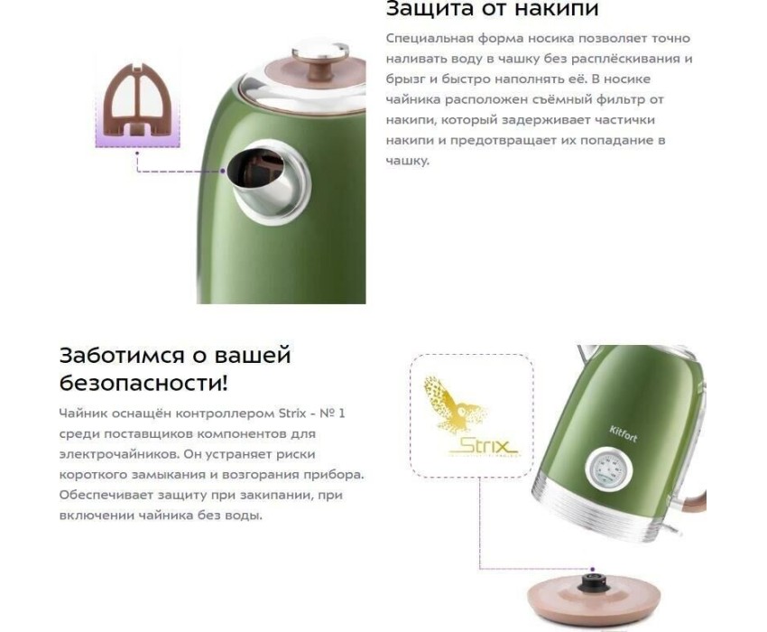 Режимы нагрева 100 °С. Ёмкость 1,7 л. Мощность 1850–2200 Вт. Длина шнура 0,75 м. Индикатор включения есть. Индикатор уровня воды есть. Фильтр от накипи есть. Автоматическое отключение есть. Подставка 360 градусов да. Защита от включения без воды есть.