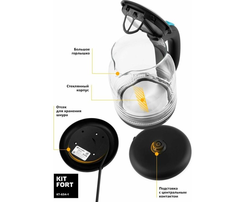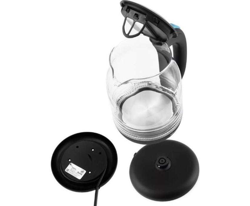 Мощность 2200 Вт. Максимальный объем 1.7 л. Нагревательный элемент скрытый. Индикатор уровня воды есть. Фильтр от накипи есть. Автоматическое отключение есть. Кнопка открытия крышки есть. Подставка 360 градусов да. Защита от включения без воды есть. Подсветка воды есть. Материал корпуса стекло и пластик.