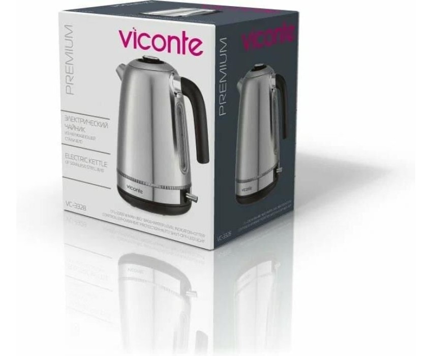 Электрочайник Viconte VC-3328 1,7 л, Электрочайник, 2200 Вт, 1,7 литра, корпус из высококачественной нержавеющей стали, закрытый нагревательный элемент, ВОЗМОЖНОСТЬ ВРАЩЕНИЯ ЧАЙНИКА НА 360°, внутренняя подсветка, шкала уровня воды, автоматическое отключение при закипании, автоматическое отключение без воды.