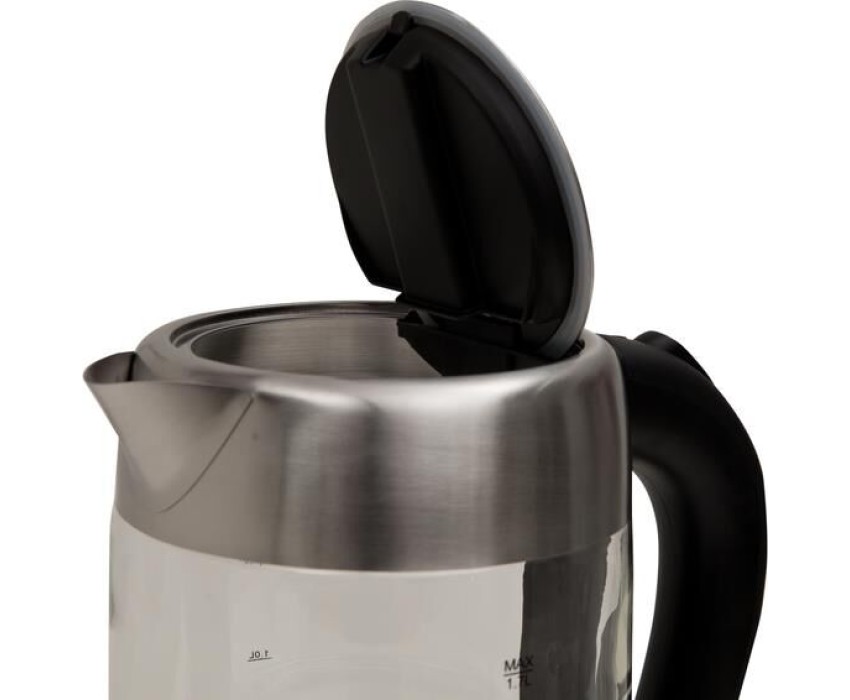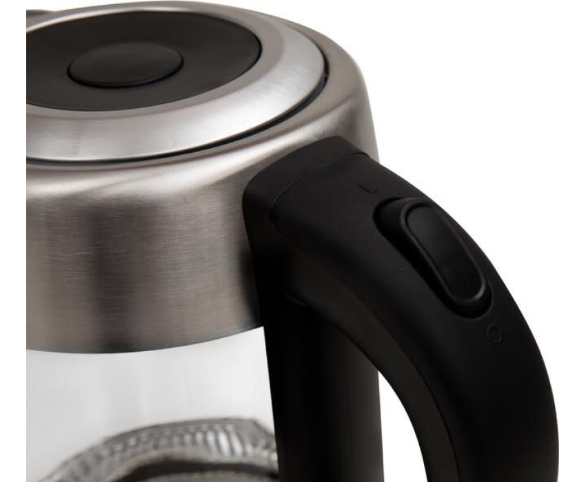 Цвет Стальной+черный Материал полости Термостойкое стекло Параметры электросети, В/Гц 220-240/50-60 Мощность, Вт 2200 Объем, л 1,7 Автоотключение Защита от включения без воды 360° поворот корпуса Корпус из термостойкого стекла LED подсветка Кнопочное открытие крышки