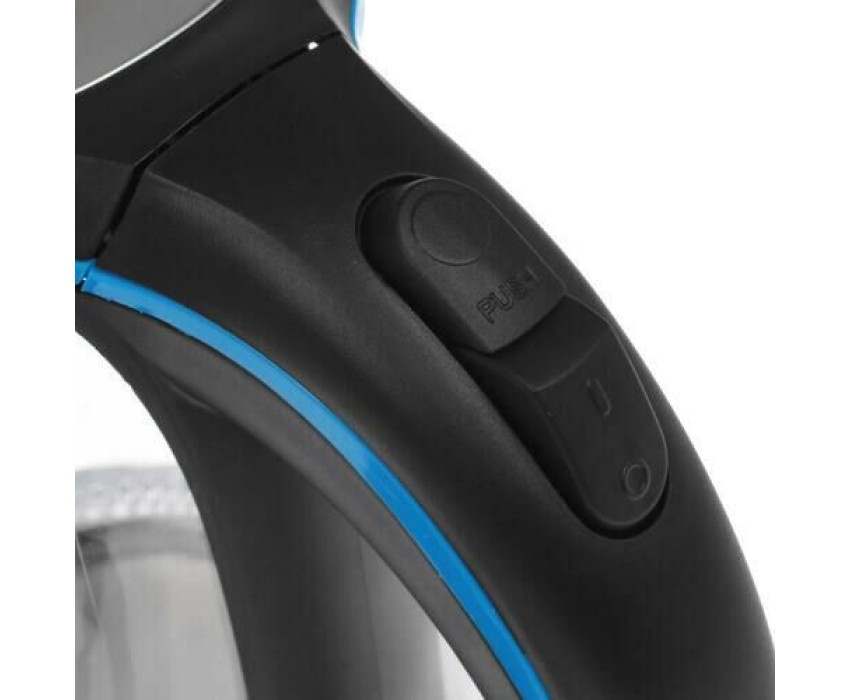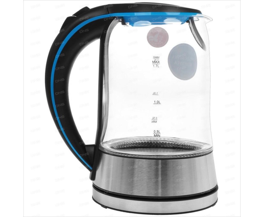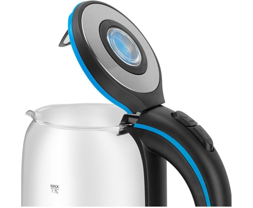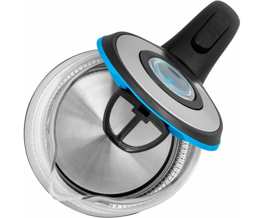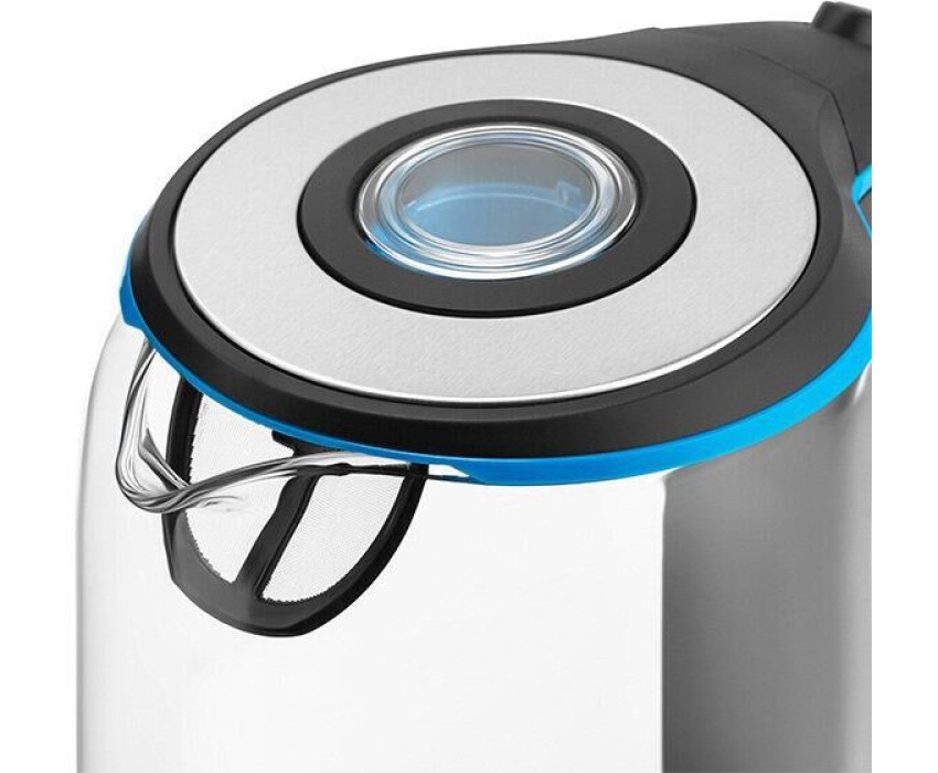 Чайник электрический. Мощность: 2200 Вт, Объем: 1,7 литра, Материал корпуса: термостойкое стекло, Способ открывания крышки: автоматическое, Подсветка, Фильтр, Индикатор уровня воды, Индикация включения, Отключение при отсутствии воды, Отсек для хранения шнура, Тип нагревательного элемента: скрытый, Длина сетевого шнура: 75 см, Цвет: Серебро/черный