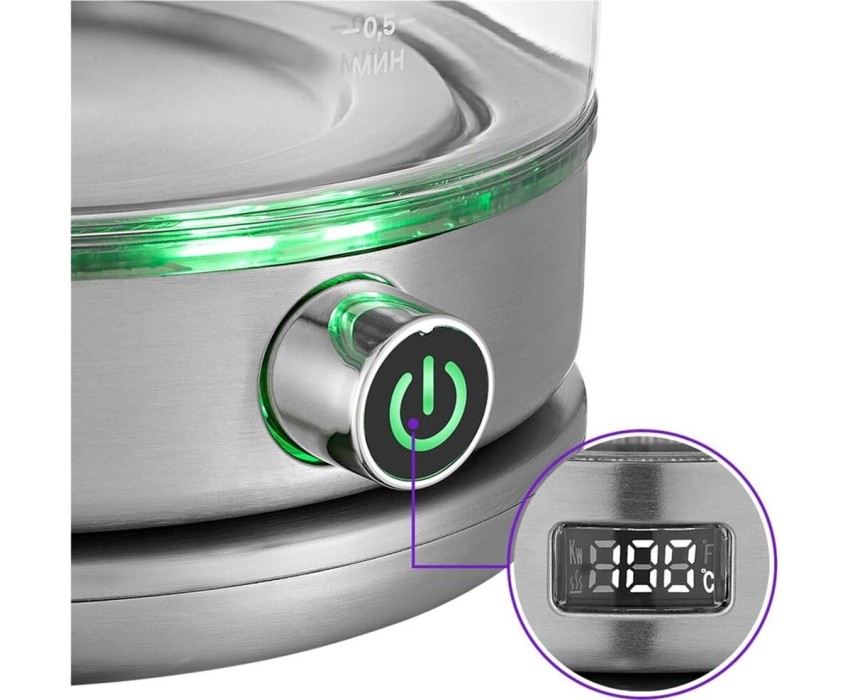 Мощность: 2200. Максимальный объем: 1.7. Нагревательный элемент: скрытый. Цвет: нержавеющая сталь. Вес товара: 1.5. Температурные режимы: 7. Габариты упаковки (ед) ДхШхВ: 0.24x0.205x0.287. Вес упаковки (ед): 1.95. Страна производства: Китай. Материал корпуса: стекло/металл. Конструктивные особенности: дисплей, подставка 360, фильтр от накипи. Дополнительные функции: поддержание температуры, регулировка температуры нагрева. Безопасность: автоотключение, защита от включения без воды. Индикация: включения, уровня воды. Объем: 1.7 л. Мощность: 2200 Вт. Нагревательный элемент: скрытый. Материал корпуса: стекло/металл