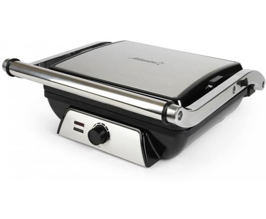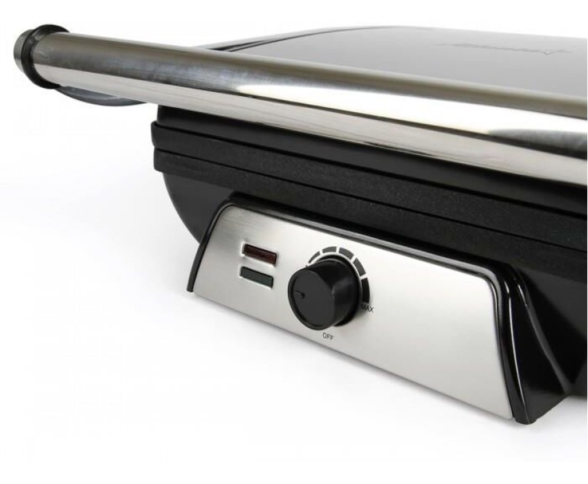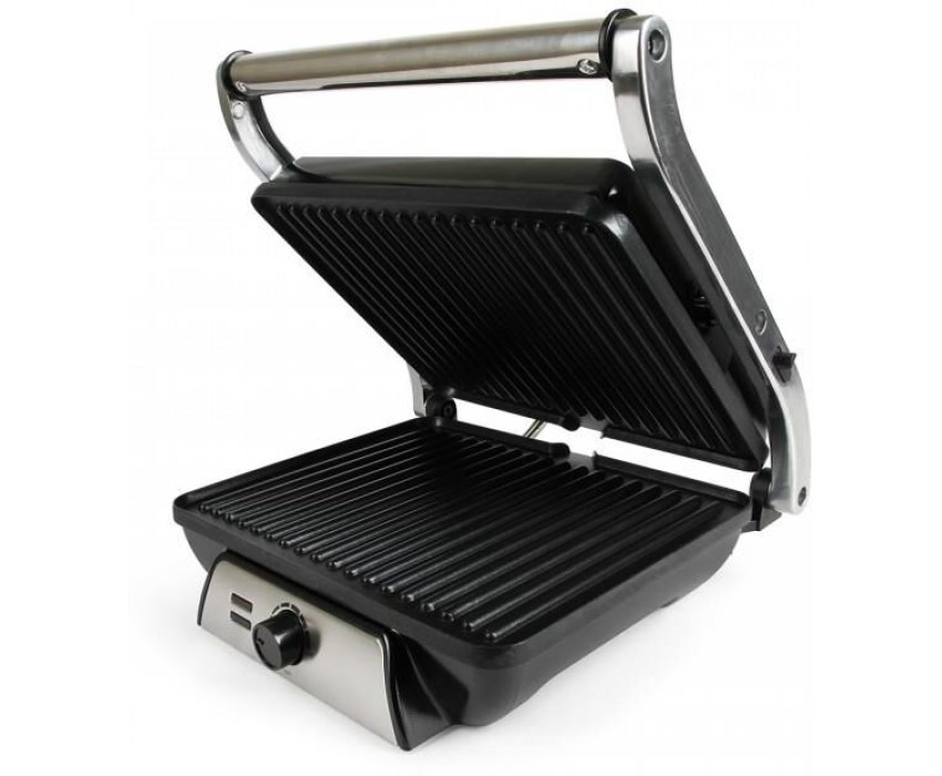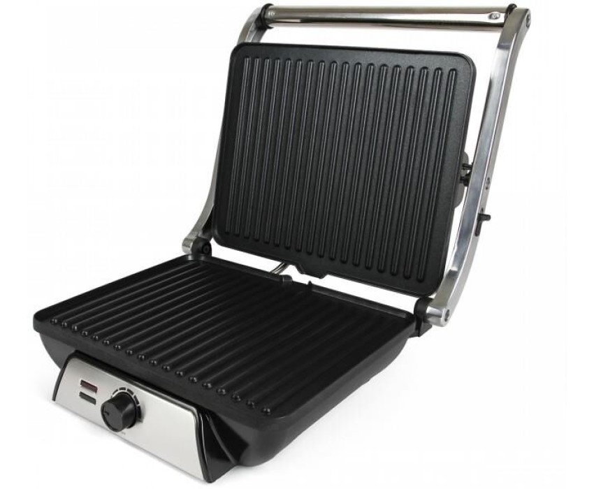 Гриль электрический, мощность 2000 Вт, регулируемый термостат (максимальная температура 240°С), 2 рифленые панели для жарки, размер панели 29,7х23,6 см, антипригарное покрытие, открытие панелей на 180° (возможность приготовления на 2 пластинах одновременно), индикатор работы, прорезиненные ножки. Корпус из нержавеющей стали и термостойкого пластика. Комплектация: резервуар для сбора масла.