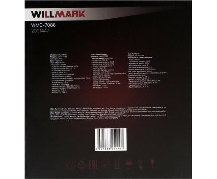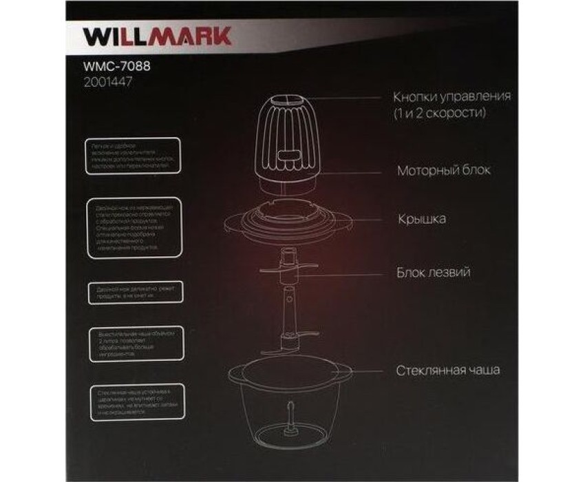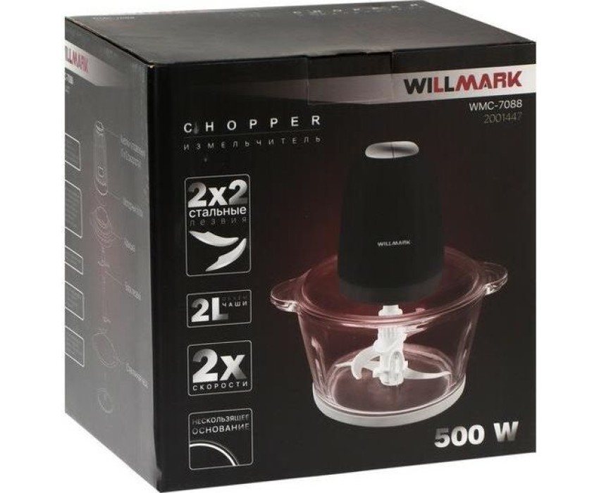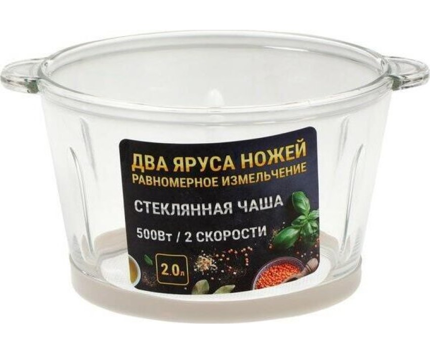 Материал чаши: стекло.Цвет черный.Мощность: 500 Вт.Насадки: универсальный нож.Объем чаши: 2 л.Режимы: импульсный.