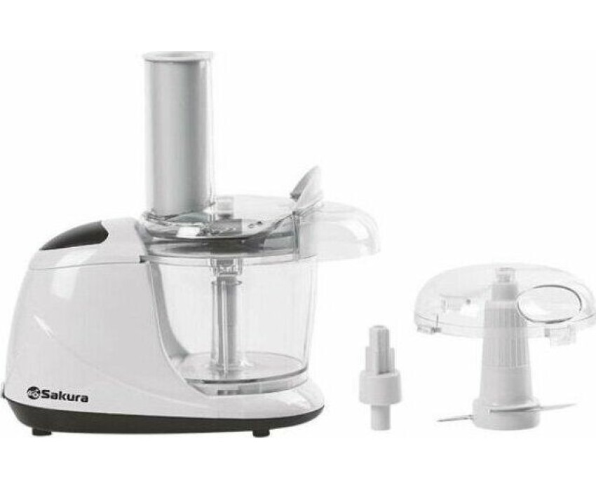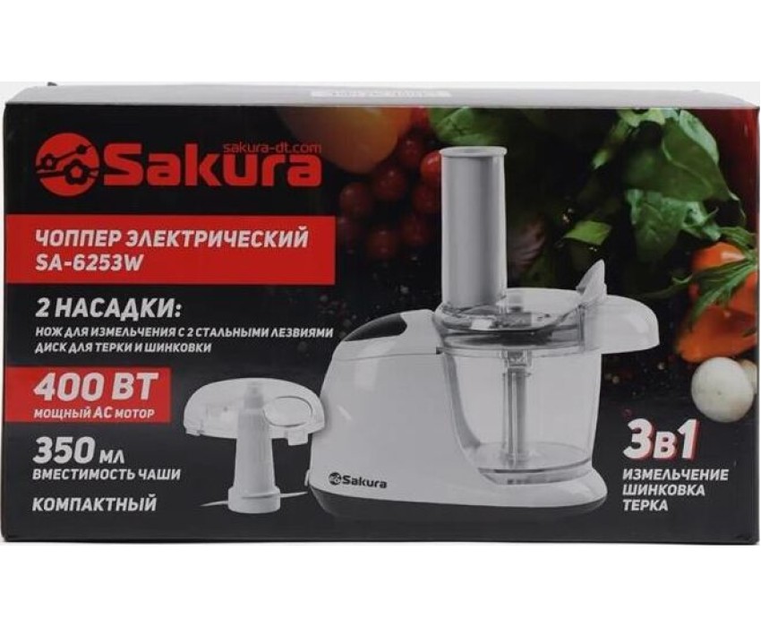 Чоппер с 2 доп. насадками. 400 Вт, 0,35 л, пластиковая чаша, 2 лезвия из нержавеющей стали, насадка для взбивания яиц и насадка для нарезки овощей, одна скорость, цвет белый.