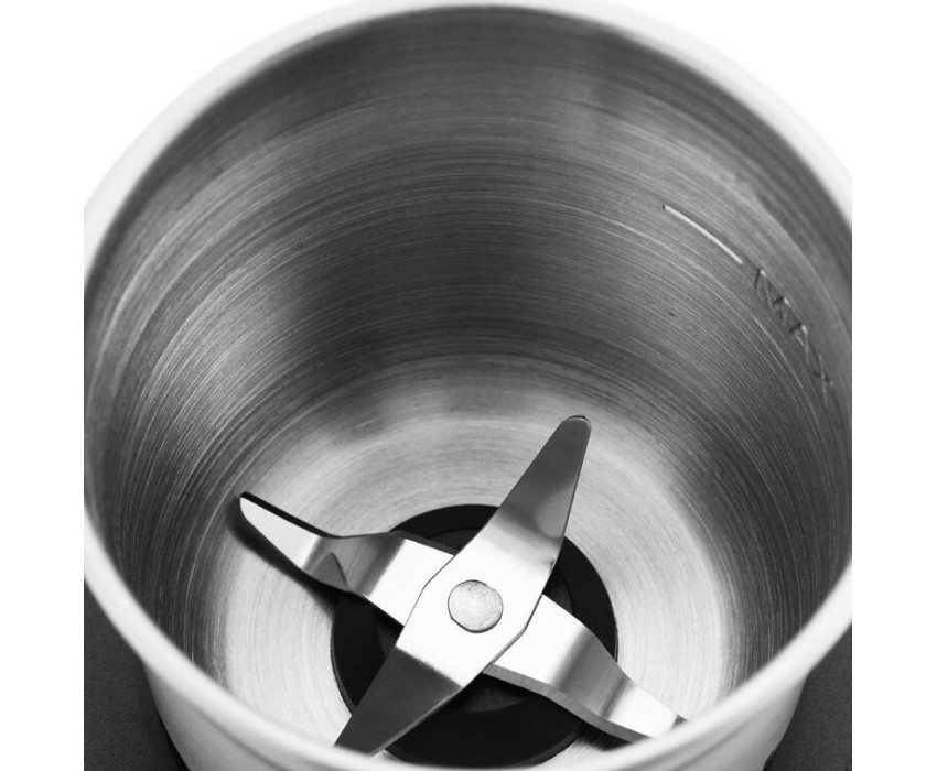 Система помола ротационный нож. Мощность 200 Вт. Вместимость 200 г. Максимальная скорость вращения 26000 об/мин. Количество степеней помола 1. Возможность помола специй есть. Съемный резервуар для кофе есть. Прорезиненные ножки есть. Материал корпуса металл. Цвет нержавеющая сталь. Размеры (ШхВхГ) 122 х 205 х 140 см.