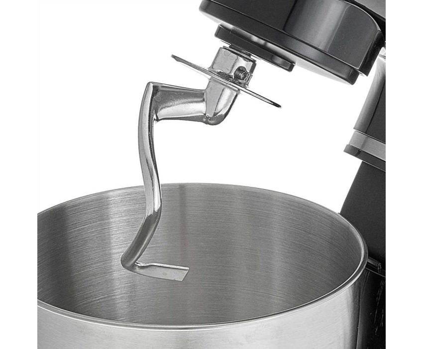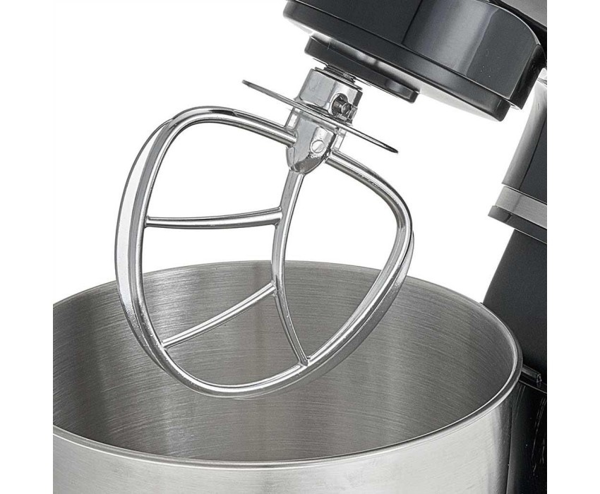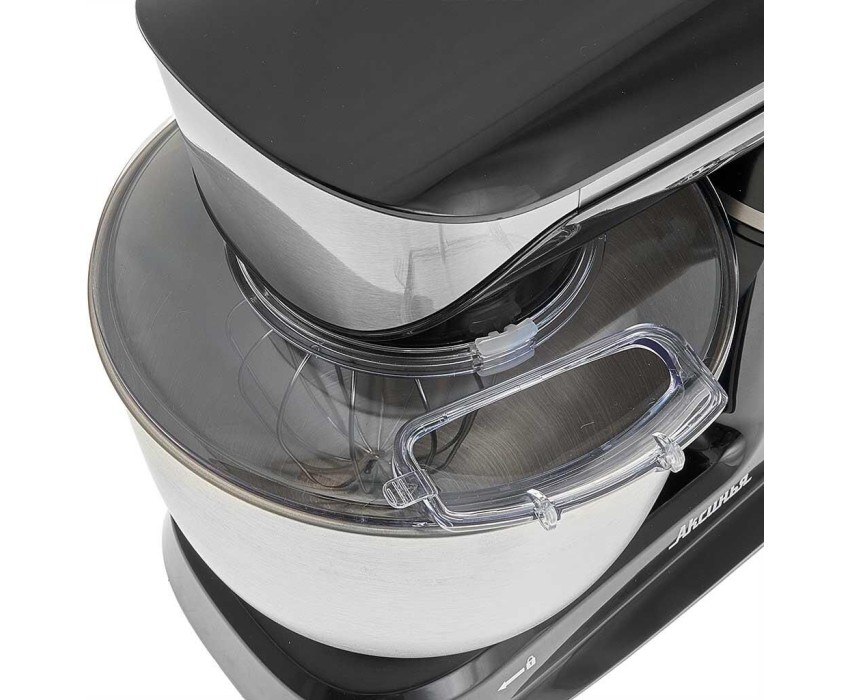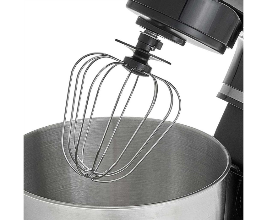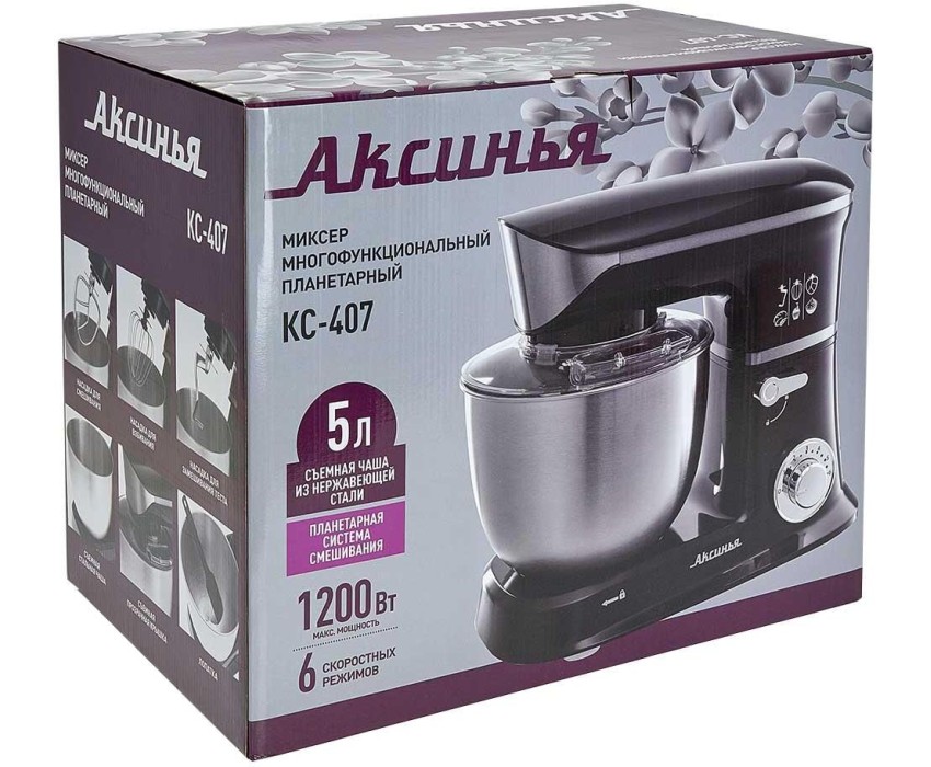 Номинальная потребляемая мощность 1200 Вт, Объем чаши 5 л, Планетарная система смешивания: миксер оснащен уникальной технологией «планетарного» движения, когда венчик совершает обороты в одну сторону, а привод в это время движется по кругу в другую сторону, позволяет осуществлять перемешивание по всему объему чаши, Цвет: черный, Съемная чаша из нержавеющей стали, Съемная прозрачная крышка чаши, Насадки: насадка для смешивания, насадка для замешивания теста, венчик для взбивания яиц и кремов, Лопатка, Противоскользящие ножки, 6 скоростных режимов, Плавная регулировка скоростей, Контроль наклона миксера, Автоматическая блокировка при неправильной установке.