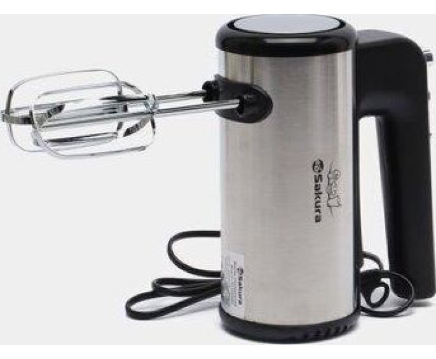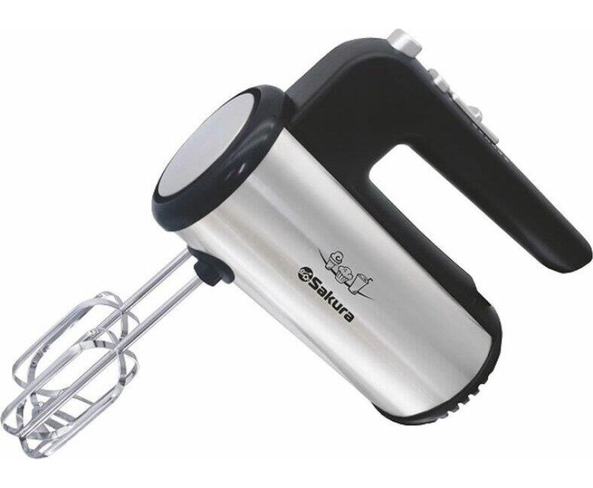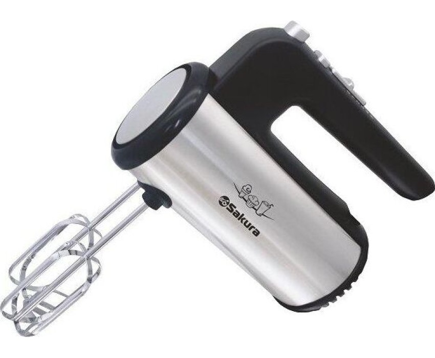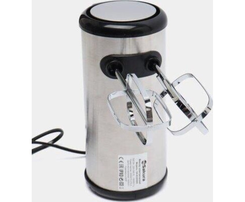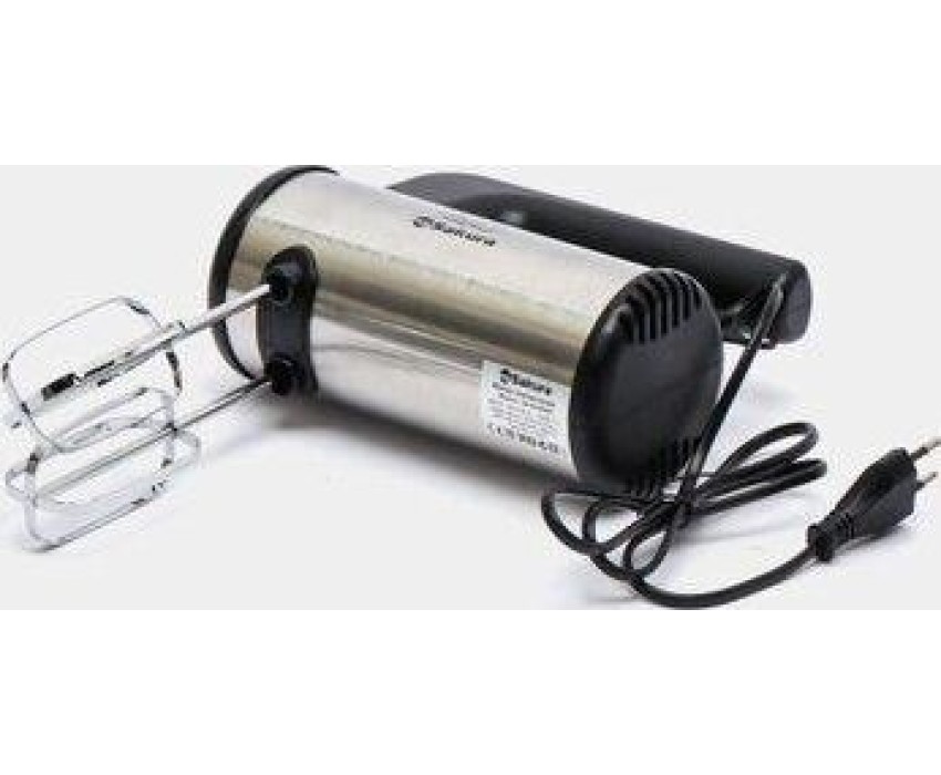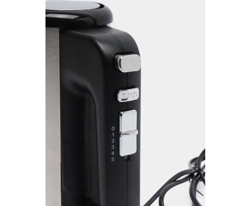 Ручной миксер, мощность 500 Вт, 5 скоростей работы + турбо-скорость, защита от перегрева, корпус и насадки из нержавеющей стали, в комплекте венчики для взбивания и крюки для замешивания теста.