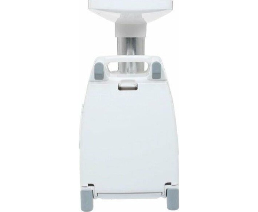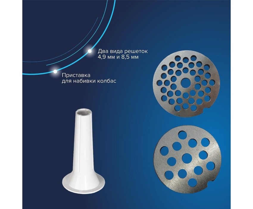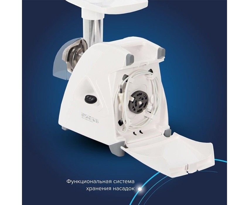Габариты 0,38 х 0,19 х 0,53 Вес 5,2кг Мощность1500 Вт Производительность 1,7 кг/мин Материал Пластик Двойная защита от перегрузки; Функция «реверс» для предотвращения наматывания жилок на шнек; Отсек в корпусе для шнура питания, хранения ножа и насадок; 3 вида решеток для получения фарша разной консистенции - с диаметром отверстий 3,5 мм и 7 мм, а также овальными отверстиями; Экран для защиты от брызг, который поможет сохранить кухню в чистоте; Высокое размещение шнековой камеры; Возможность вертикального хранения для экономии пространства на кухне; Ручка для переноски; Устойчивые нескользящие ножки для фиксации мясорубки на поверхности стола;