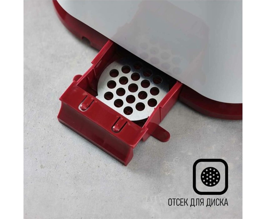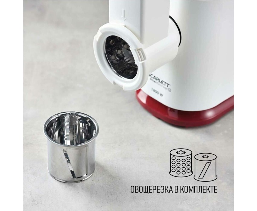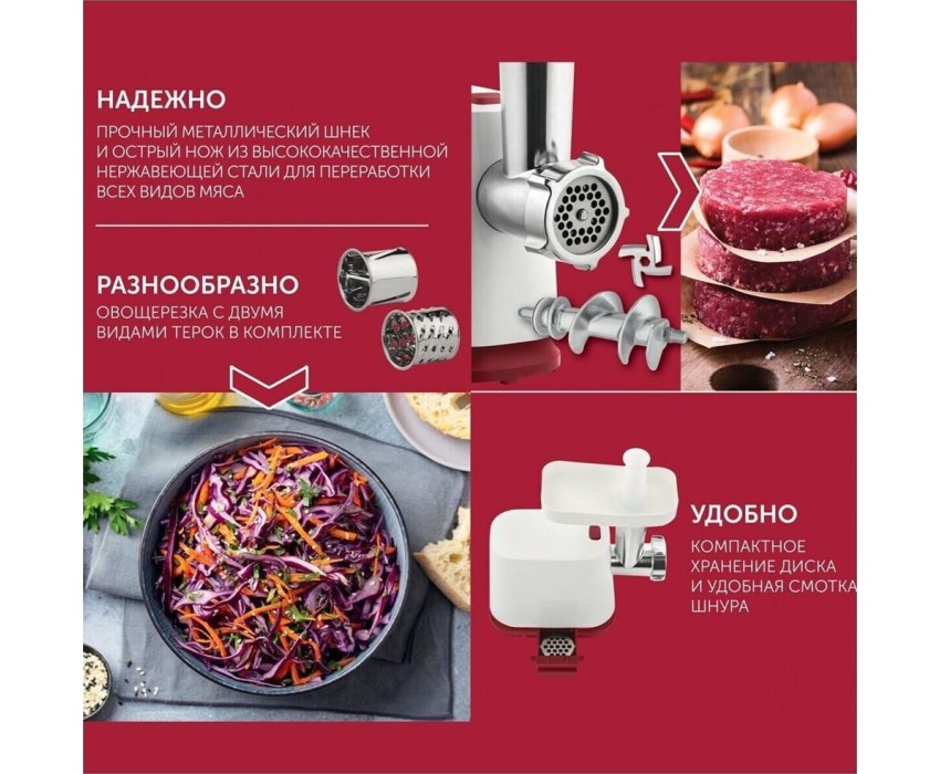Тип: С овощерезками. Мощность, Вт: 1800. Производительность кг/мин: 2. Функция реверс: Да. Перфорированные диски для мяса, размер отверстий мм: 5 и 7. Защита двигателя от перегрузки: Да. Нож из нержавеющей стали: Да. Насадка кеббе: Да. Насадка для приготовления домашних сосисок: Да. Насадки для терки и шинковки овощей, шт.: 2. Материал лотка для подачи мяса: Пластик. Резиновые ножки для повышенной устойчивости: Да. Количество решеток: 2. Особенности модели: Отсек для хранения диска. Цвет: Белый с красным.