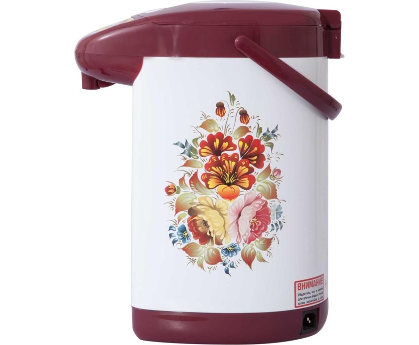 Термопот электрический, Мощность 750Вт, Объем 4 литра, Способ подачи воды - механический, электрический, касанием чашкой, Защита от перегрева, Защита от перепада напряжения, Функция повторного кипячения.
