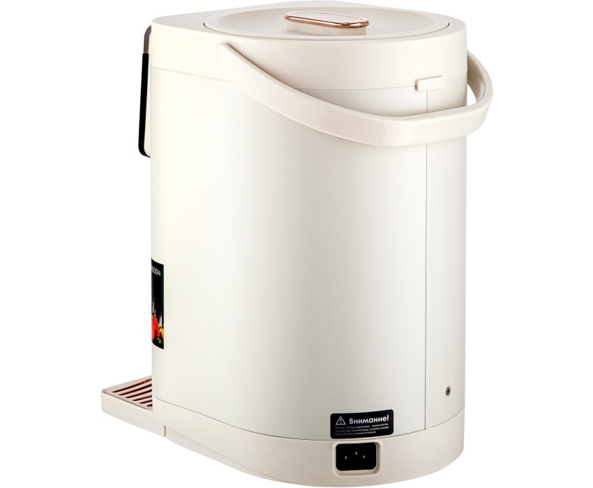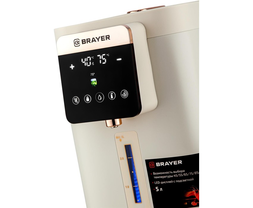 Максимальная мощность 1450 Вт Максимальный объем 5 л Подача воды с помощью автоматической помпы Поддержание температуры воды для разных напитков (45°/55°/65°/75°/85°/95°С) Функция повторного кипячения Функция поддержания температуры воды Сенсорное управление LED-дисплей Блокировка подачи воды Корпус из высококачественного металла Съёмный поддон для капель Автоотключение при отсутствии воды Электропитание 220-240 В, ~ 50-60 Гц