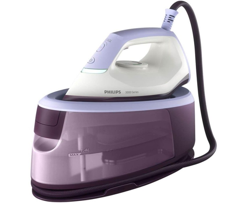Парогенератор 3000 series, 2400 Вт, Макс. давление 6 бар, 120 г/мин непрерывный пар, Паровой удар 350 г, Прочная и легко скользящая керамическая подошва, Съемный резервуар для воды объемом 1,4 л, Керамическая подошва, Подходит для водопроводной воды, Решение для очистки от накипи: Smart Calc Clean, Время нагрева: 2 минуты, Длина шнура питания: 1,6 м, Длина шланга: 1,6 м., автоматическое отключение, вертикальное отпаривание. Цвет - Сиреневый