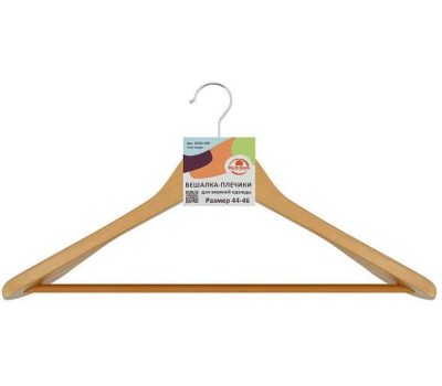 Вешалка-плечики поможет организовать пространство в шкафу, наведет порядок в гардеробе, сохранит одежду опрятной и выглаженной. Вешалка с широкими плечиками предназначена для размещения и хранения верхней одежды – пальто, шуб, плащей, курток, пуховиков, а также пиджаков, жакетов, рубашек, платьев, костюмов и другой одежды. Наличие перекладины позволит разместить одновременно несколько вещей на вешалке, ее можно использовать для хранения брюк, галстуков, шарфов, платков. Вешалка подходит для одежды 44-46 размера. Изготовлено: вешалка из дерева, крючок из металла.