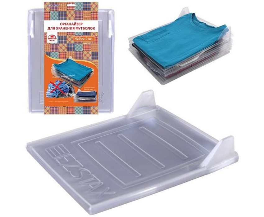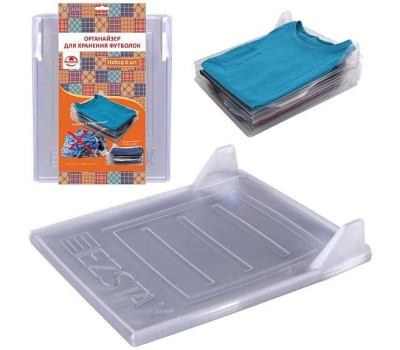 Органайзер для хранения футболок состоит из 6 прозрачных пластин, поможет содержать вещи в порядке, организует пространство в шкафу. Используется, как протекторы между аккуратно сложенными в стопку футболками или сорочками. Благодаря такой системе хранения ваши вещи не помнутся, будут всегда на виду, вы легко сможете найти то, что вам надо, и без затруднений достанете любую из них из стопки, не смяв другие. Перед первым применением, помыть и просушить. Изготовлено: из пластмассы (поливинилхлорид). Размер: 34*29*5см.