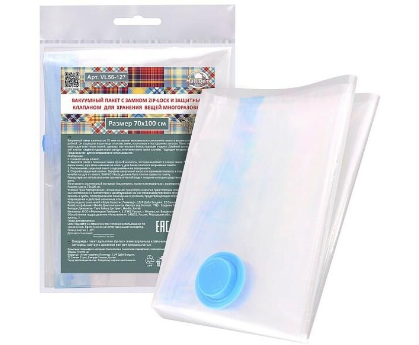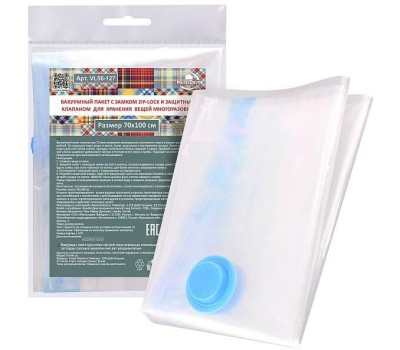 Вакуумный пакет плотностью 70 мкм позволяет максимально сэкономить место в вашем шкафу или гардеробной. Он защищает ваши вещи от влаги, пыли, насекомых и посторонних запахов. Пакет можно использовать для всех типов тканей, одежды, постельного белья, подушек и одеял. Двойной замок и автоматический клапан надёжно удерживают вакуум в течение всего срока службы. Подходит ко всем типам пылесосов. Предназначен для многоразового использования. Изготовлено: пакет-полимерный материал (полиэтилен низкого давления высокой плотности, полиэтилентерефталат), клипса и защитный клапан-пластмасса (полипропилен). Размер пакета 70х100 см.