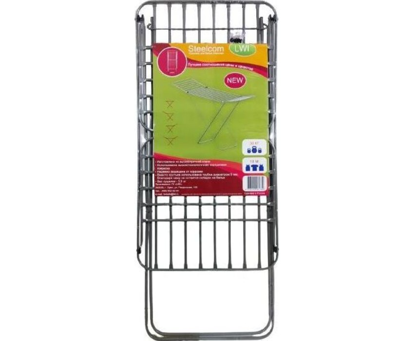 Сушилка для белья напольная складная. Стальной каркас серебристого цвета с антикорозийным полимерным покрытием и усиленными трубочными прутьями большого диаметра 9 мм .Общая рабочая длина прутьев 18 м. Рабочая нагрузка 30 кг. В разложенном виде габариты. 171х55х93 В сложенном виде габариты 55х5х119 вес 3,9 кг пр-во РОССИЯ