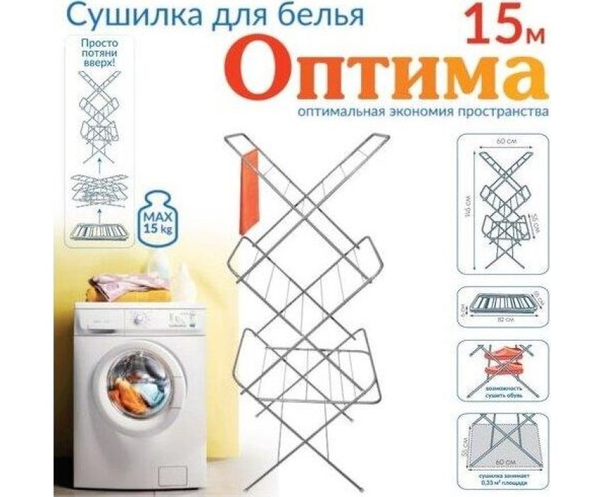 Тип товара: сушилка для белья Серия: Оптима Длина: 145 см Ширина: 55 см Высота: 60 см Максимальная нагрузка: 20 кг Размещение: напольная Материал корпуса: металл Конструкция: складная Рабочая длина: 15 м Цвет: серый Прутья: металлические