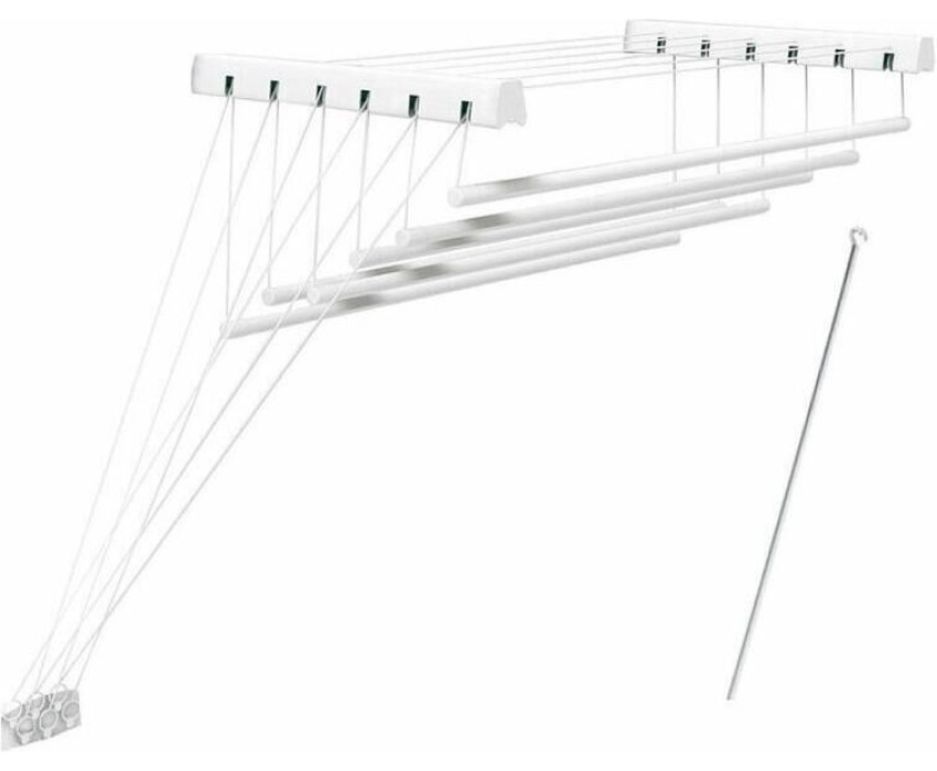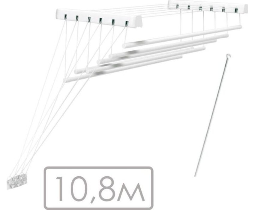 ЦВЕТ: белый. РАЗМЕР ИЗДЕЛИЯ: 430 x 1 800 x 1 350 мм. МАТЕРИАЛ: металл + полипропилен. Представляет из себя конструкцию из крепежных кронштейнов, штанг-трубок, на которых развешивается бельё, и веревочной системы для фиксирования штанг на двух разных положениях: на высоте комфортной для развешивания белья и на высоте для сушки белья. Суммарная длина поверхности для размещения белья - 10,8м. Максимальная нагрузка - 12кг.
