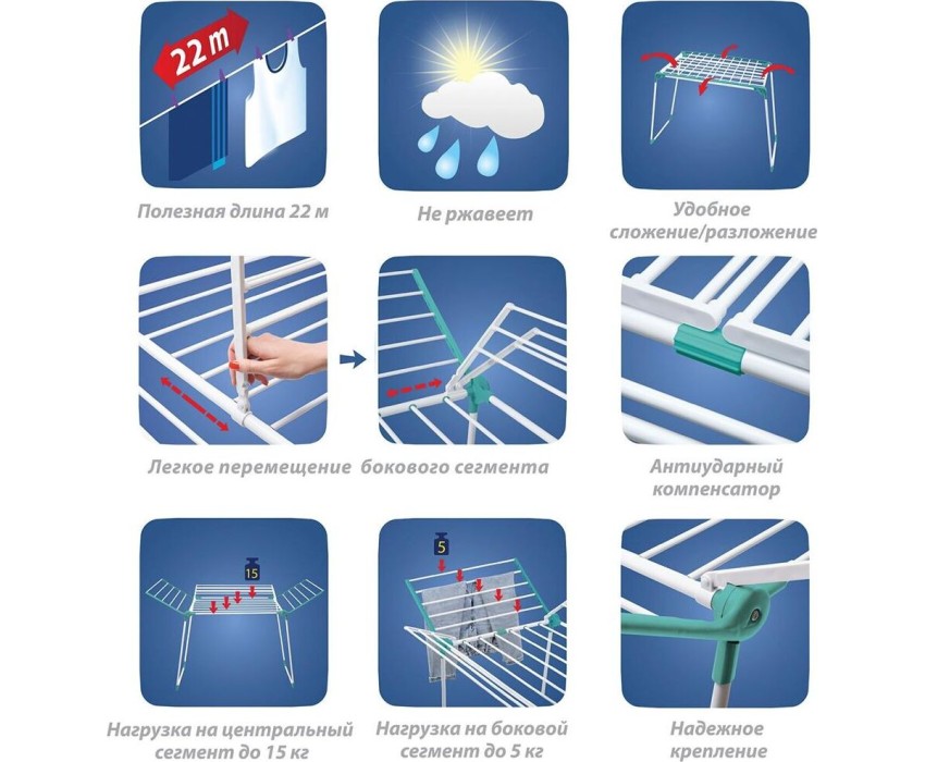 Напольная сушилка для белья Arcturus – это практичное решение для сушки белья дома. Ее конструктивная особенность в сочетании с компактностью позволяет сушить как большое, так и небольшое количество белья. В случае необходимости боковой элемент легко перемещается, сокращая габариты сушилки. Диаметр металлических прутьев позволяет сушить белье без заломов. Качественное порошковое окрашивание металлических элементов конструкции защищает от образования ржавчины. Полезная площадь для навески белья – 22 м. В разложенном состоянии габаритные размеры:168 см х 59,5 см х 86 /108 см. Высота боковых элементов 108 см. В сложенном состоянии: 96 см х 59,5 см х х 6,5 см. Состав: металл, пластик