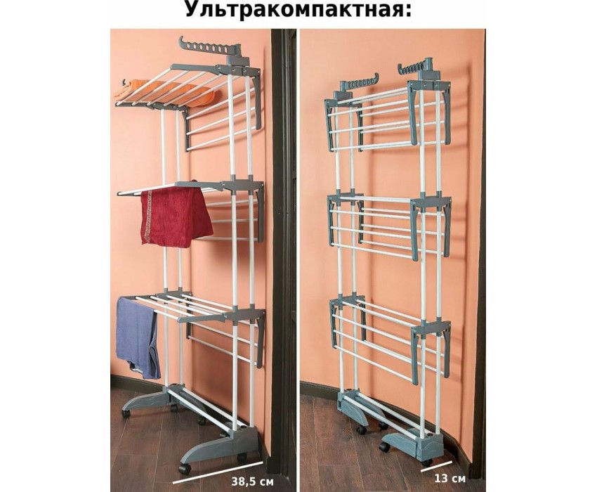 Многофункциональная напольная сушилка для белья Helex — незаменимая вещь в любом доме. Имеет три яруса для сушки белья, дополнительные крючки позволяют сушить одежду прямо на плечиках, имеется подставка для обуви. Благодаря колёсикам в комплекте, сушилка очень мобильная, ее можно легко переместить с одного места на другое. Ярусы для сушки складные, поэтому сушилка не будет занимать много места. Отлично подойдет в помещениях с ограниченным пространством. Идеально подходит для ванных комнат и даже балконов. • Размер разложенный: 75-126х64х170 см • Размер сложенный: 75х13х173 см • Материал: металлическая труба 19мм/13мм; полипропилен • Цвет: белый + серый • Опции: 3 уровня, 6 полок (снимаемые), складывающееся основание • Колёса: 6 штук • Длина сушильной поверхности: 1860 см • Максимальная нагрузка: 30 кг • Размер упаковки: 80х20х13 см • Количество в упаковке: 1 шт • Вес нетто: 3,95 кг • Вес брутто: 4,1 кг • Производитель: Helex • Страна: Китай