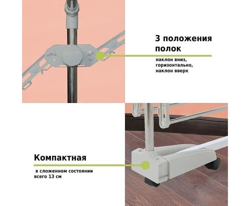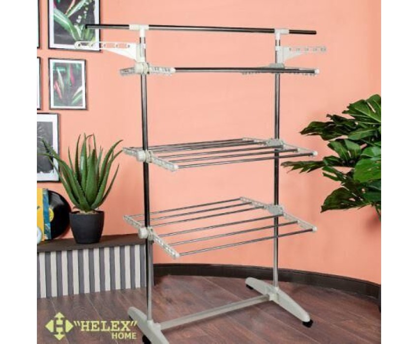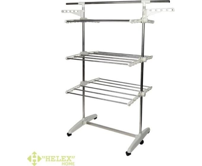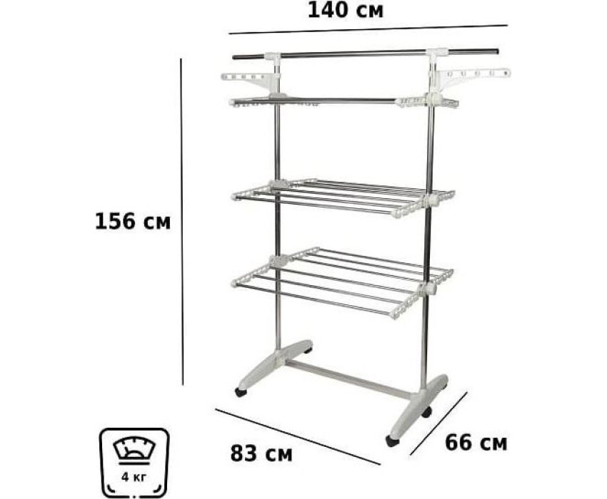 для обуви. Благодаря колёсикам в комплекте, сушилка очень мобильная, ее можно легко переместить с одного места на другое. Ярусы для сушки складные, поэтому сушилка не будет занимать много места. Отлично подойдет в помещениях с ограниченным пространством. Идеально подходит для ванных комнат и даже балконов. • Размер разложенный: 83-140х66х156 см • Размер сложенный: 78,8х13х153,3 см • Материал: металлическая труба 25/22/11 мм, ABS-пластик • Цвет: белый • Опции: 3 уровня, 6 полок (снимаемые), складывающееся основание • Колёса: 6 штук • Длина сушильной поверхности: 14,5 м • Максимальная распределённая нагрузка: 50 кг • Размер упаковки: 79х33х16 см • Количество в упаковке: 1 шт • Вес нетто: 4 кг • Вес брутто: 5 кг • Производитель: Helex • Страна: Китай