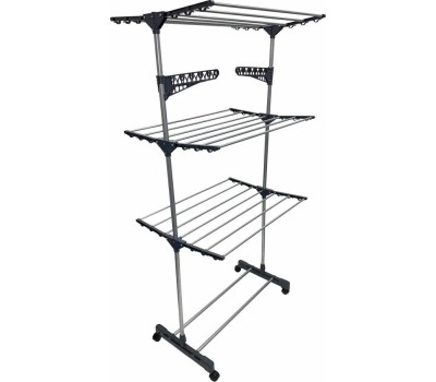 UniStor WINGS Сушилка для белья складная, на колёсиках, 3-х ярусная, с дополнительными держателями. Размер 80х57х165см. Материал окрашенная сталь и пластик, цвет серый. • Максимальная нагрузка до 12 кг •Общая длина 16,8 м. • Два дополнительных держателя для вешалок •Складная, напольная •Сбалансированная, устойчивая конструкция на колёсиках •Компактная в хранение и надёжная в использовании