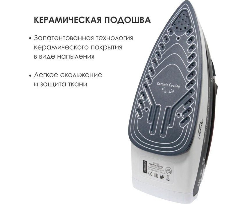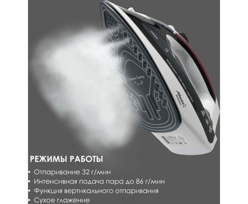 Макс. мощность 2000 Вт. Керамическая подошва. Функция самоочистки. Сухой или паровой режим глаженья. Функция вертикального пара. Прозрачный резервуар д/воды. Функция увлажнения. Регулировка подачи пара до 32 г/мин. Доп. подача пара до 86 г/мин.