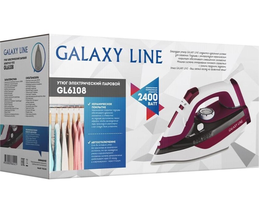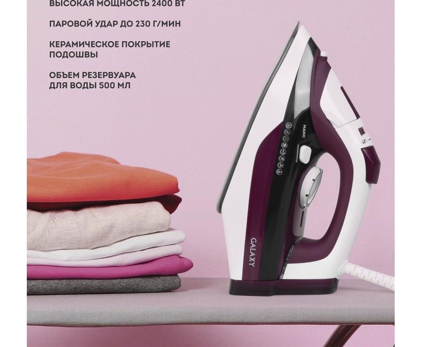 Утюг 2400 Вт, керамическое покрытие подошвы, уплотнитель крышки резервуара, функции: автоотключение, самоочистка, антикапля, антинакипь, индикатор автоотключения, указатель максимального уровня воды, индикатор нагрева, вертикальное отпаривание/ паровой удар, функция увлажнения, защита от перегрева, емкость для воды 500мл, мерный стакан, питание 220-240В, 50Гц