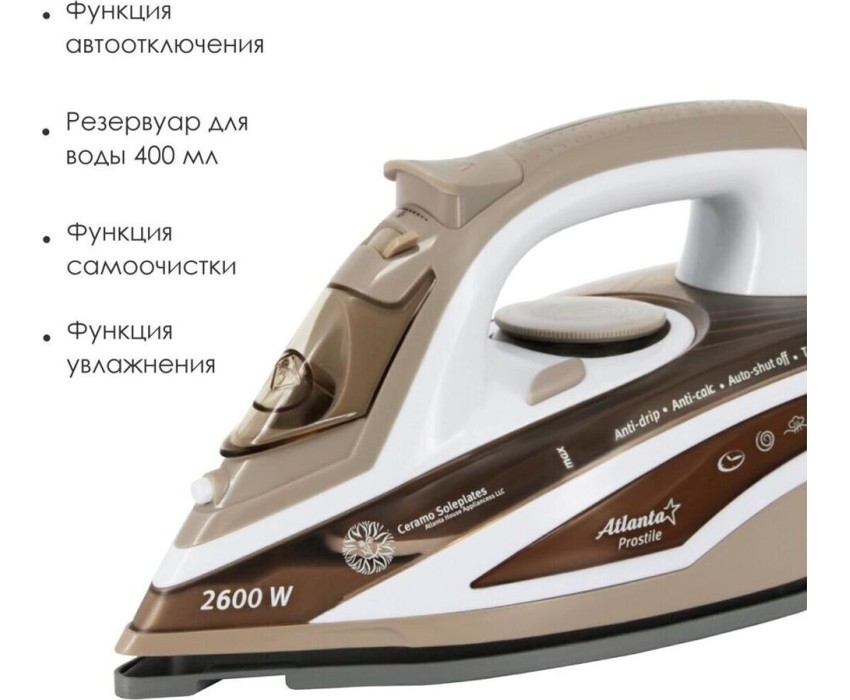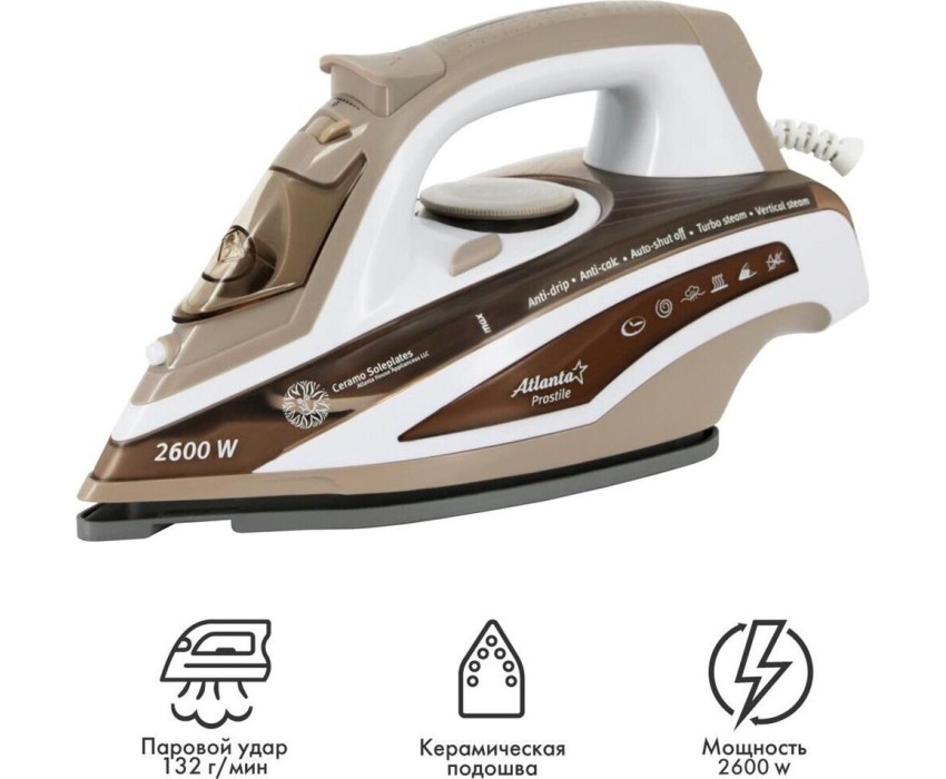 Номинальная мощность 2600 Вт. Высокоэффективная керамическая подошва. Прозрачный резервуар для воды 400мл. Функция автоматического отключения. Уникальная подошва с выемкой под пуговицы. Противокапельная система. Система против образования накипи. Сухой или паровой режим глажения. Функция вертикального пара. Функция увлажнения. Регулировка подачи пара до 38 г/мин . Дополнительная подача пара до 94 г/мин. Длина провода питания 1,9 м.. 230 B ~ 50 Гц.