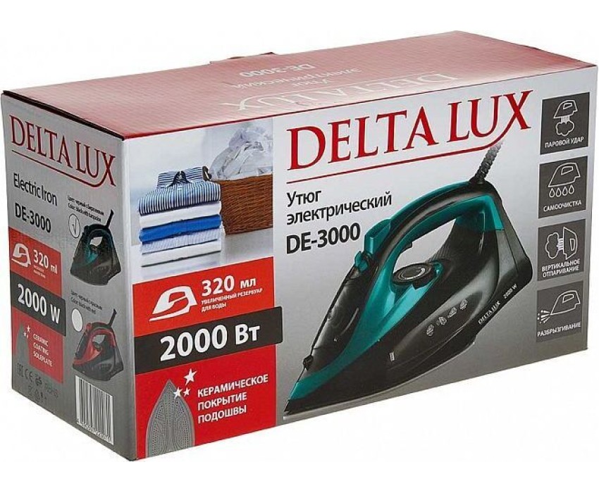 DELTA LUX DE-3000 черный с бирюзовым Номинальная потребляемая мощность 2000 Вт Объем резервуара для воды 320 мл Паровой удар 130 г/мин Регулируемая подача пара до 20±5 г/мин Длина шнура 1,8 м Описание Утюг электрический предназначен для глажения и отпаривания текстильных изделий, разглаживания складок и заминов на одежде в бытовых или аналогичных бытовым условиях Цвет: черный с бирюзовым Подошва с керамическим покрытием Увеличенный резервуар для воды 320 мл Специальный стаканчик для заполнения резервуара водой Индикатор нагрева утюга Терморегулятор Три рабочих режима: сухое глажение, отпаривание, разбрызгивание воды Возможность регулировки степени отпаривания Возможность вертикального отпаривания Функция «Паровой удар» Функция «Самоочистка» Защита от перегрева