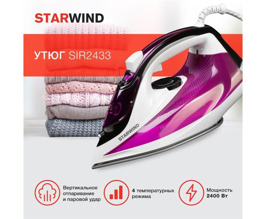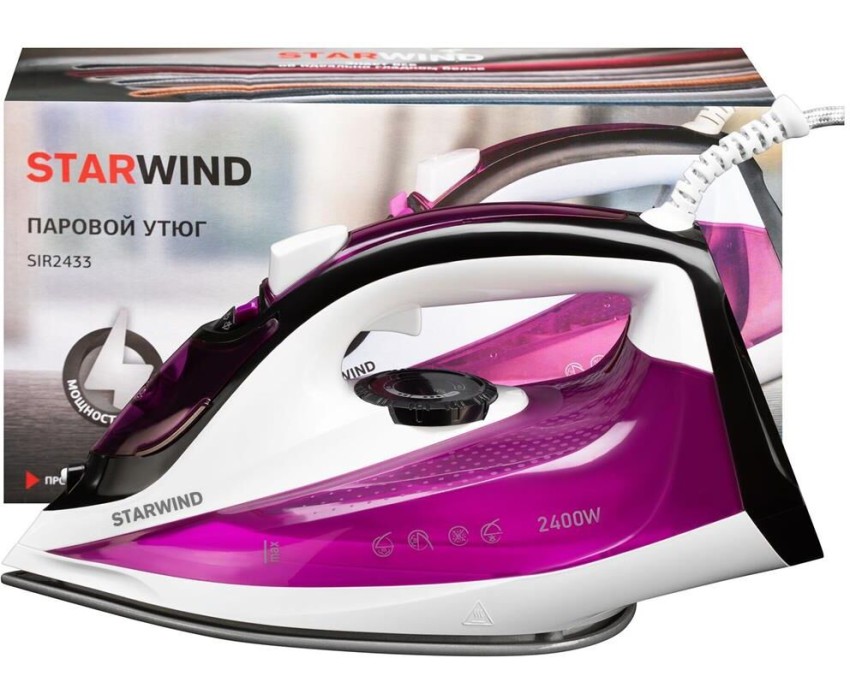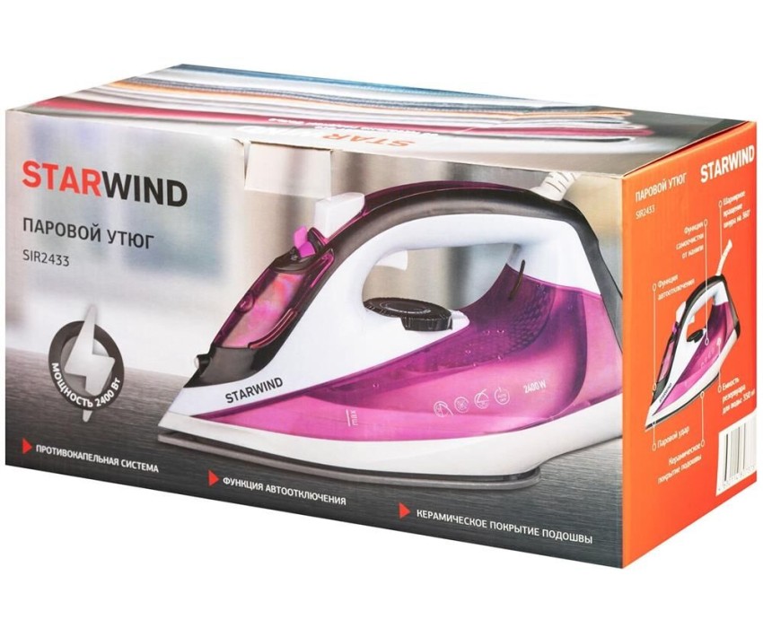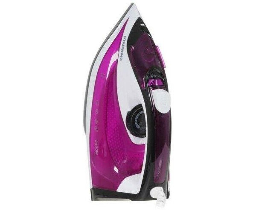 ренд STARWIND Цвет фиолетовый/белый Версия Global Мощность 2400 Вт Материал подошвы керамика Вертикальное отпаривание есть Автоматическое отключение есть Дополнительные функции паровой удар, система самоочистки, функция разбрызгивания Защита Защита от перегрева, самоочистка от накипи, система самоочистки Конструкция Объeм резервуара для воды 350 мл Длина сетевого шнура 2 м Вес и габариты Размеры ДхШхВ: 27х28.20х14.20 см Вес 1.4 кг Прочее Особенности Вертикальное отпаривание, Противокапельная система, Распылитель для воды Входит в комплект документация, утюг