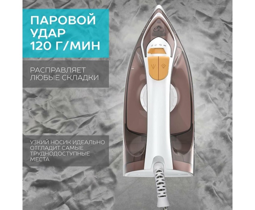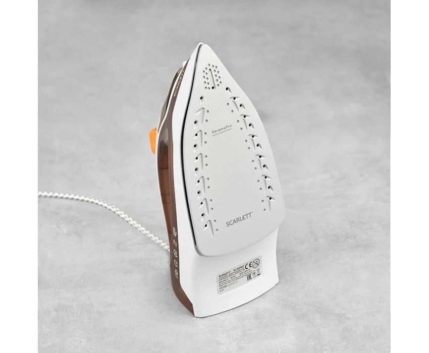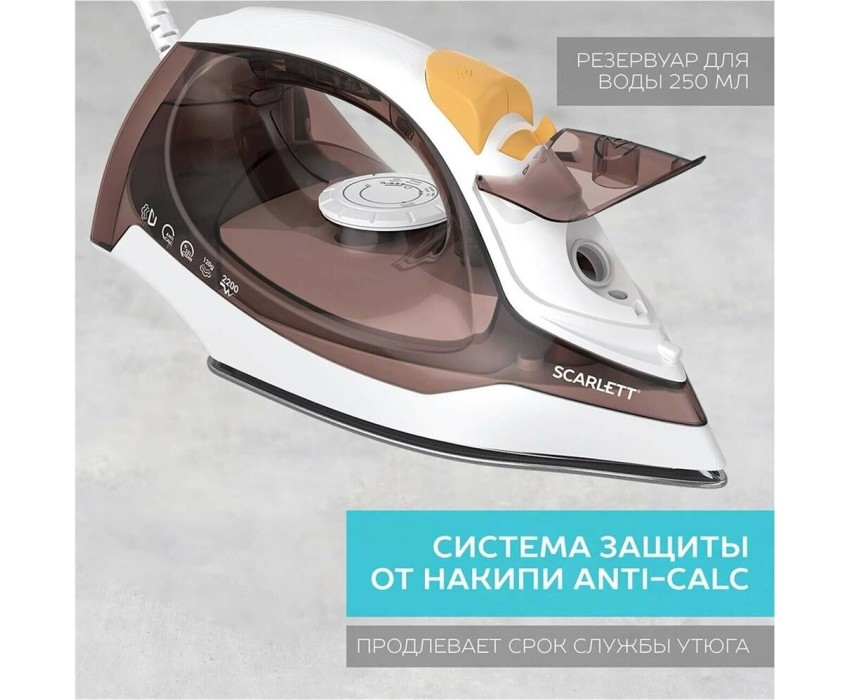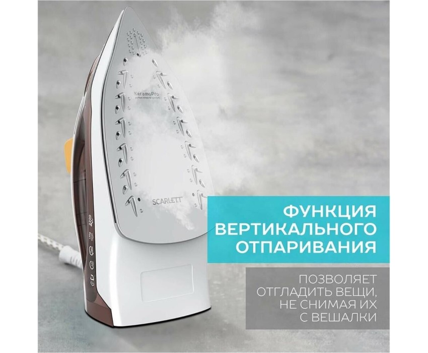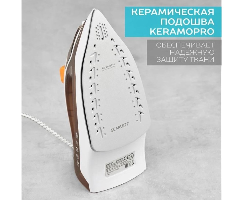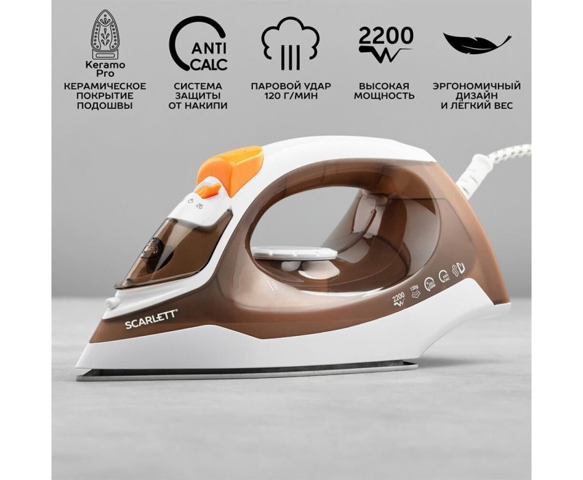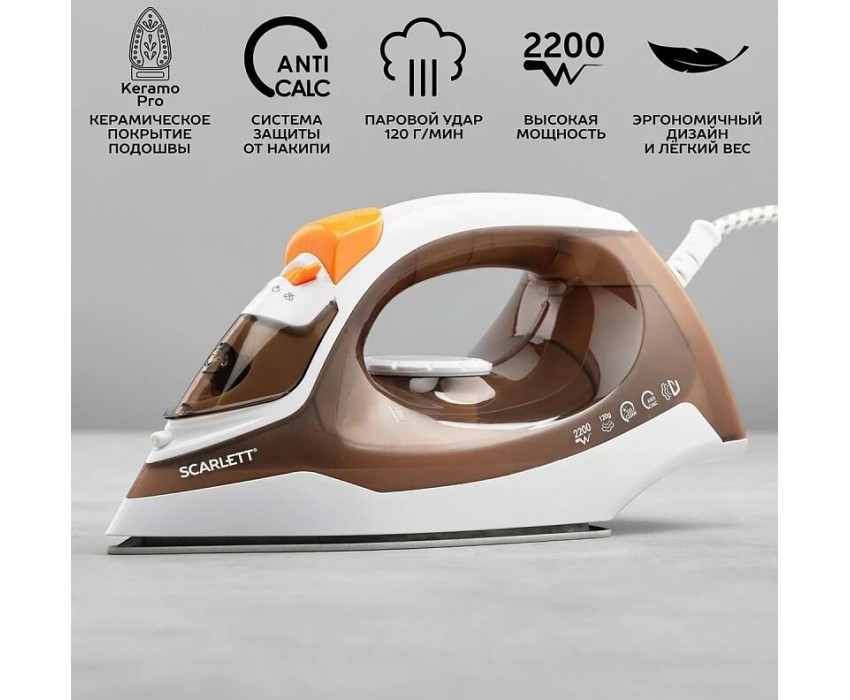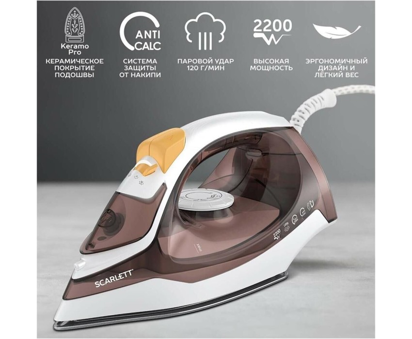 Мощность, Вт: 2200 Световой индикатор работы: Да Регулируемый пар до г/мин: 60 Паровой удар до г/мин: 120 Резервуар для воды, мл: 250 Функция разбрызгивания воды: Да Терморегулятор: Да Вертикальное отпаривание: Да Регулировка степени отпаривания: Да Покрытие подошвы: Керамическая подошва KeramoPro Самоочистка: Да Система защиты от накипи ANTI-CALC: Да Размер утюга Ш*В*Г, мм: 280*118*136 Шарнирное крепление шнура: Да Длина электрошнура, м: 1.6 Цвет: Коричневый Утюг Scarlett SC-SI30K47, выполненный в коричневом цвете, оснащён подошвой с керамическим покрытием KeramoPro, которая обеспечивает отличное скольжение и бережное отношение ко всем видам тканей. Максимальная мощность 2200 Вт позволит в считанные минуты справиться даже с тканями со сложной фактурой, а различные температурные режимы помогут выбрать оптимальный для того, чтобы самые деликатные ткани выглядели после глажения идеально. В режиме парового удара создает 120 грамм пара в минуту