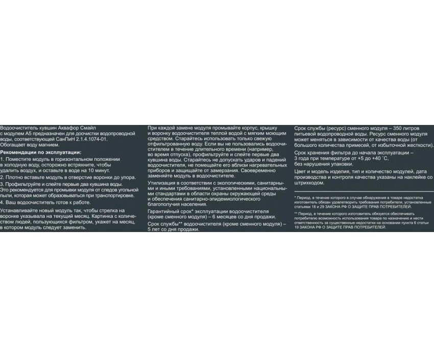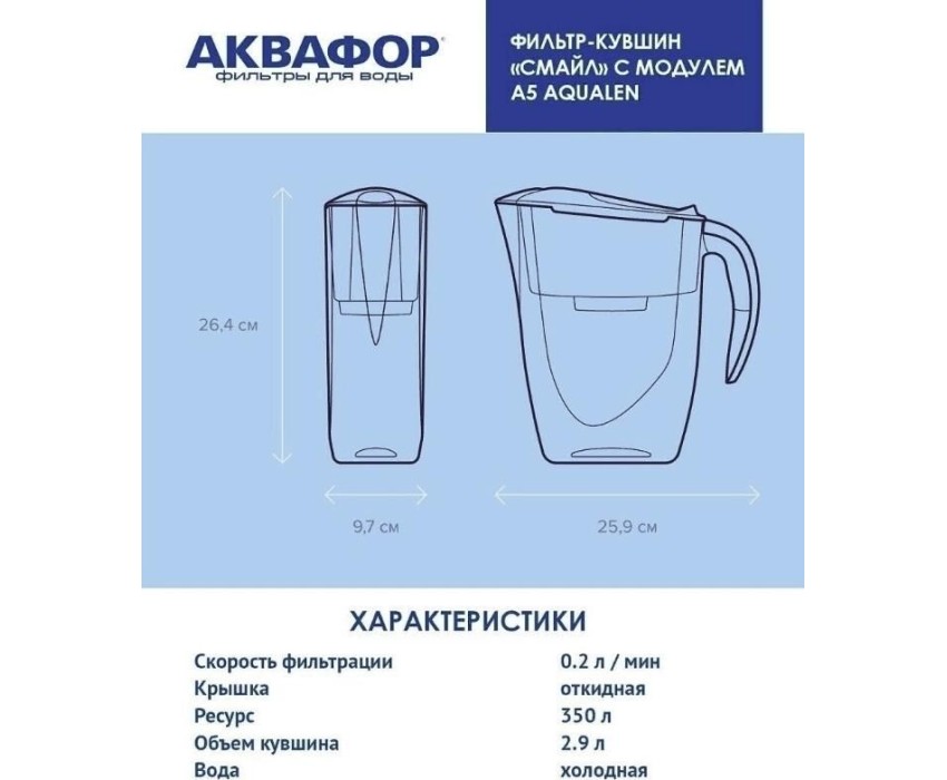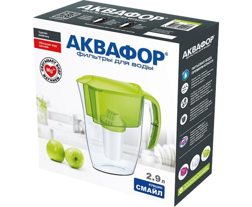 Очищает воду там, где вам нужно * Очень прост в использовании * Все детали выполнены из качественного пищевого пластика * Ресурс: 350 л * Скорость фильтрации: 0.2 л/мин * Объем кувшина / воронки: 2,4 / 1 л * Габариты: 26,7x10,2x26,7 см * Смайл очищает воду от: активного хлора, органических веществ, свинца, тяжелых металлов, коллоидного железа