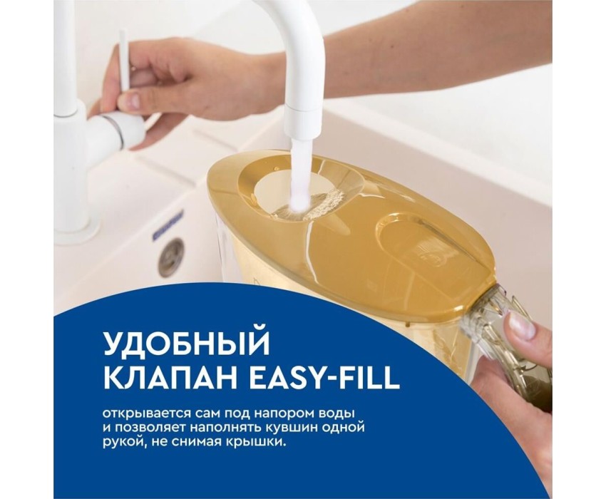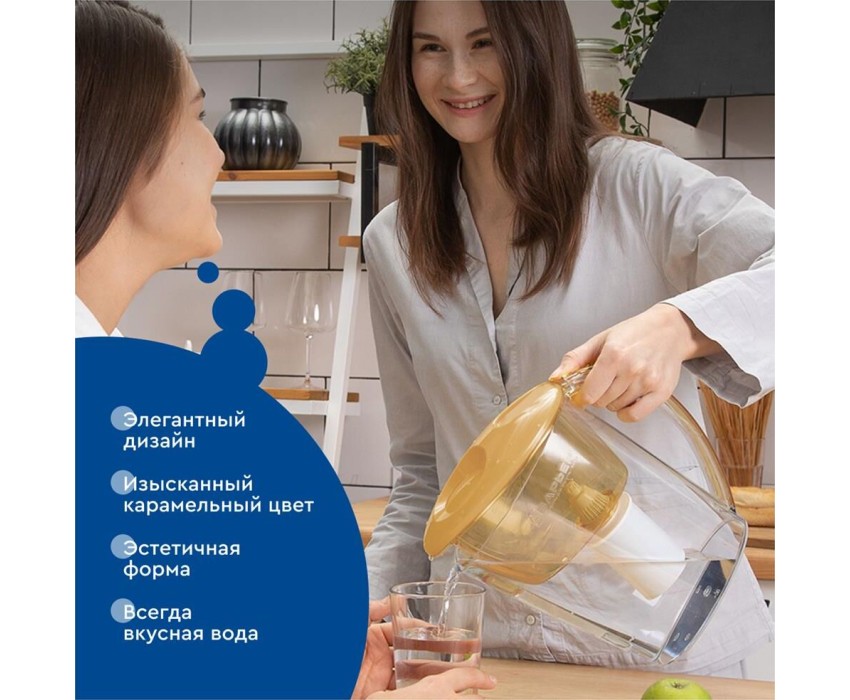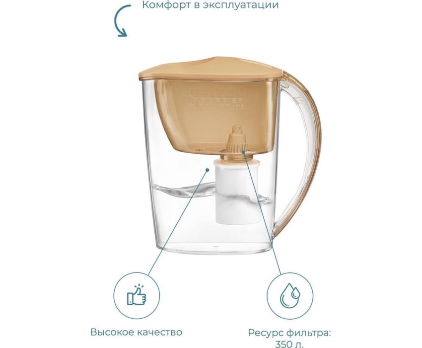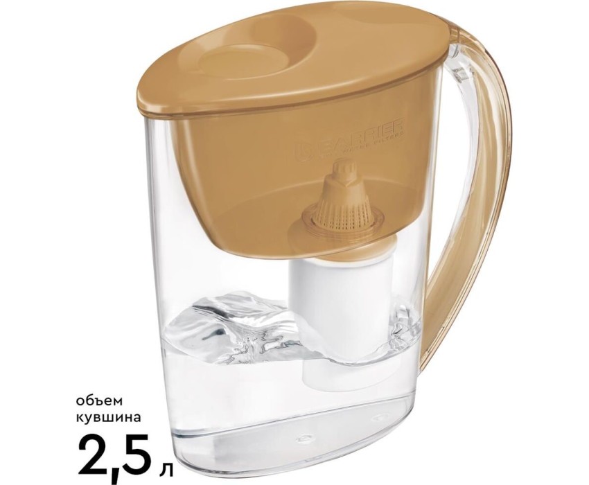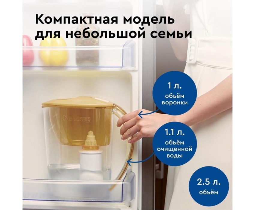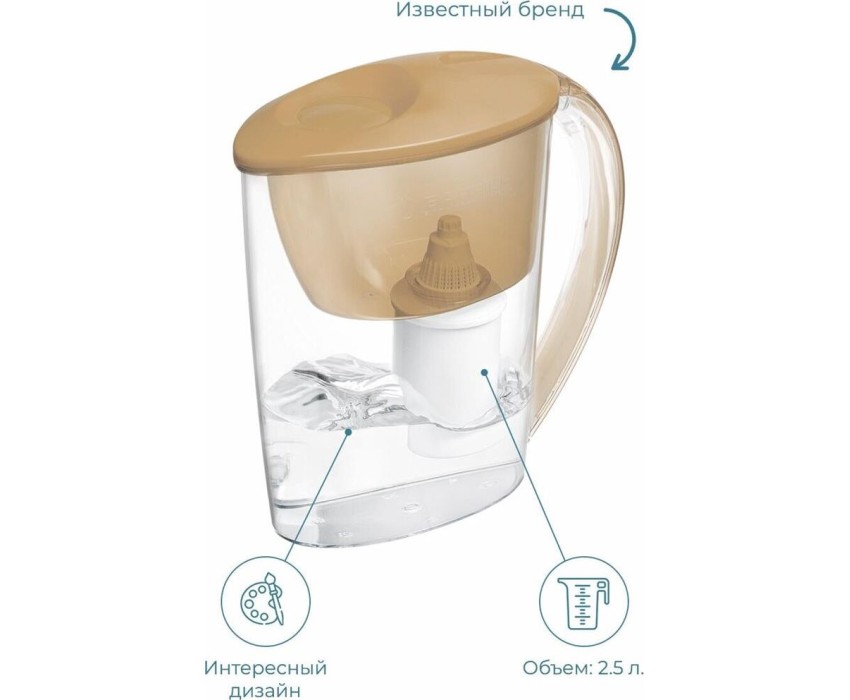 Объём кувшина 2,5 л, Размеры упаковки 250x100x260мм, Возможность размещения в дверце холодильника да, Объём очищенной воды 1,1 л, Наличие и тип индикатора ресурса Нет индикатора, Объём фильтра-кувшина маленький, Цвет карамельный капучино, Объём воронки 1 л