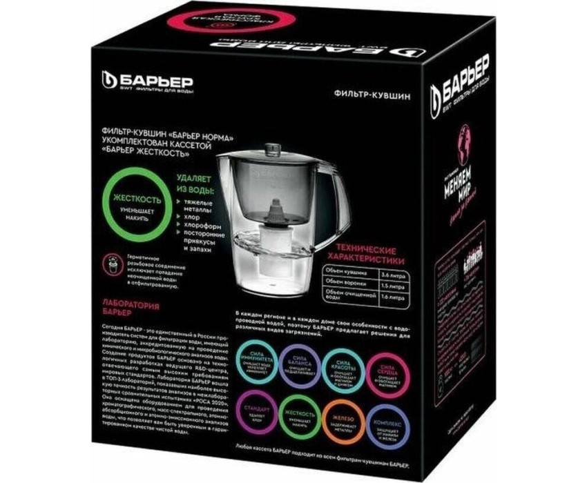 объем очищенной воды 1.6 л; объем воронки 1.5 л; допустима поставка разных вариантов комплектации - с кассетой «стандарт» или кассетой «жесткость»